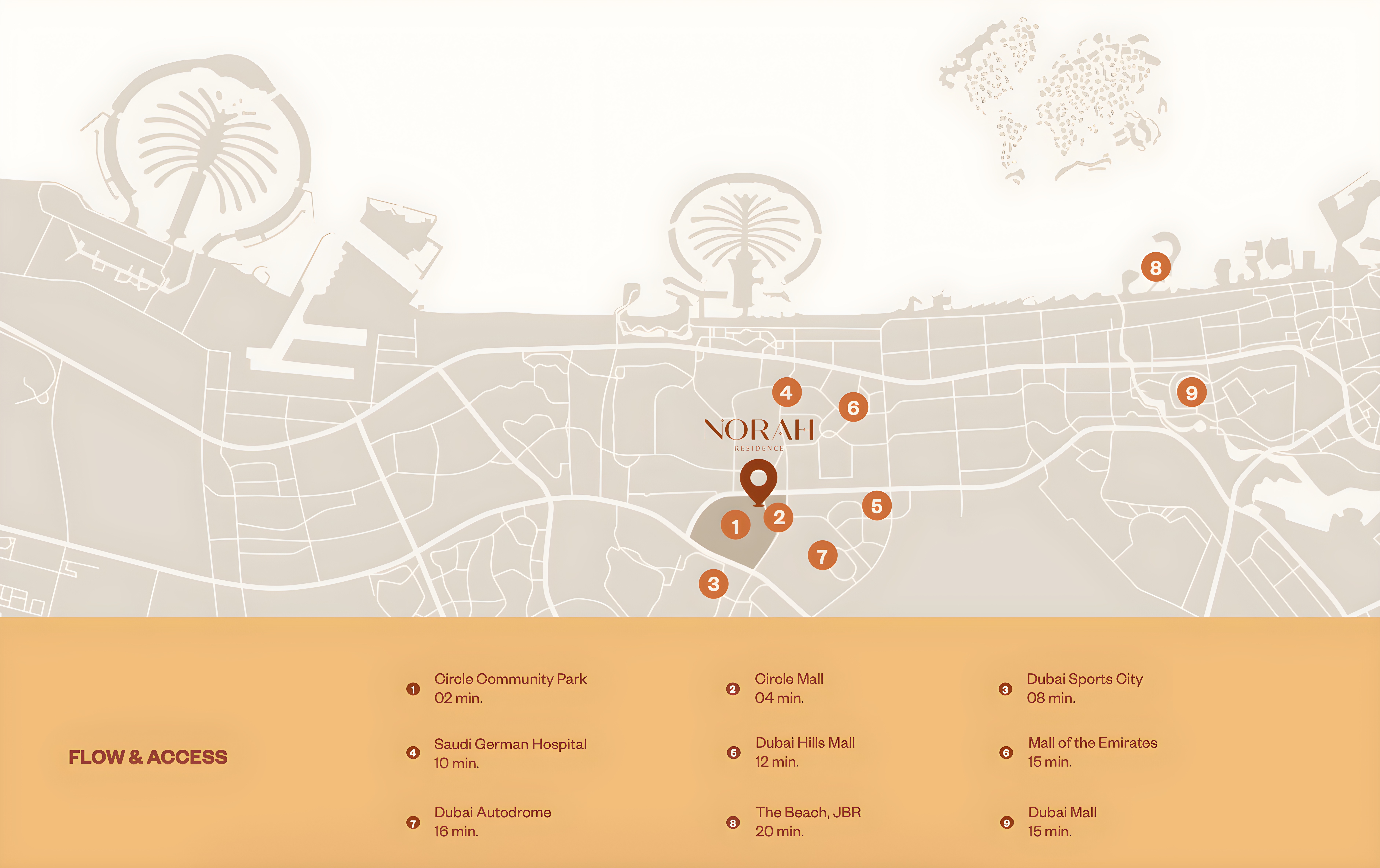 Strategically located in District 14 of JVC, Norah Residence offers residents a unique advantage. JVC is renowned for its master-planned design, featuring lush landscaped gardens, expansive green spaces, and a tranquil, family-friendly atmosphere. This prime positioning ensures seamless connectivity to Dubai’s major business hubs, leisure destinations, and arterial roads, while providing a peaceful retreat from the city's hustle. Within walking distance, residents will find an array of retail outlets, dining experiences, top-rated schools, and healthcare facilities, cultivating a self-sufficient and vibrant community lifestyle.