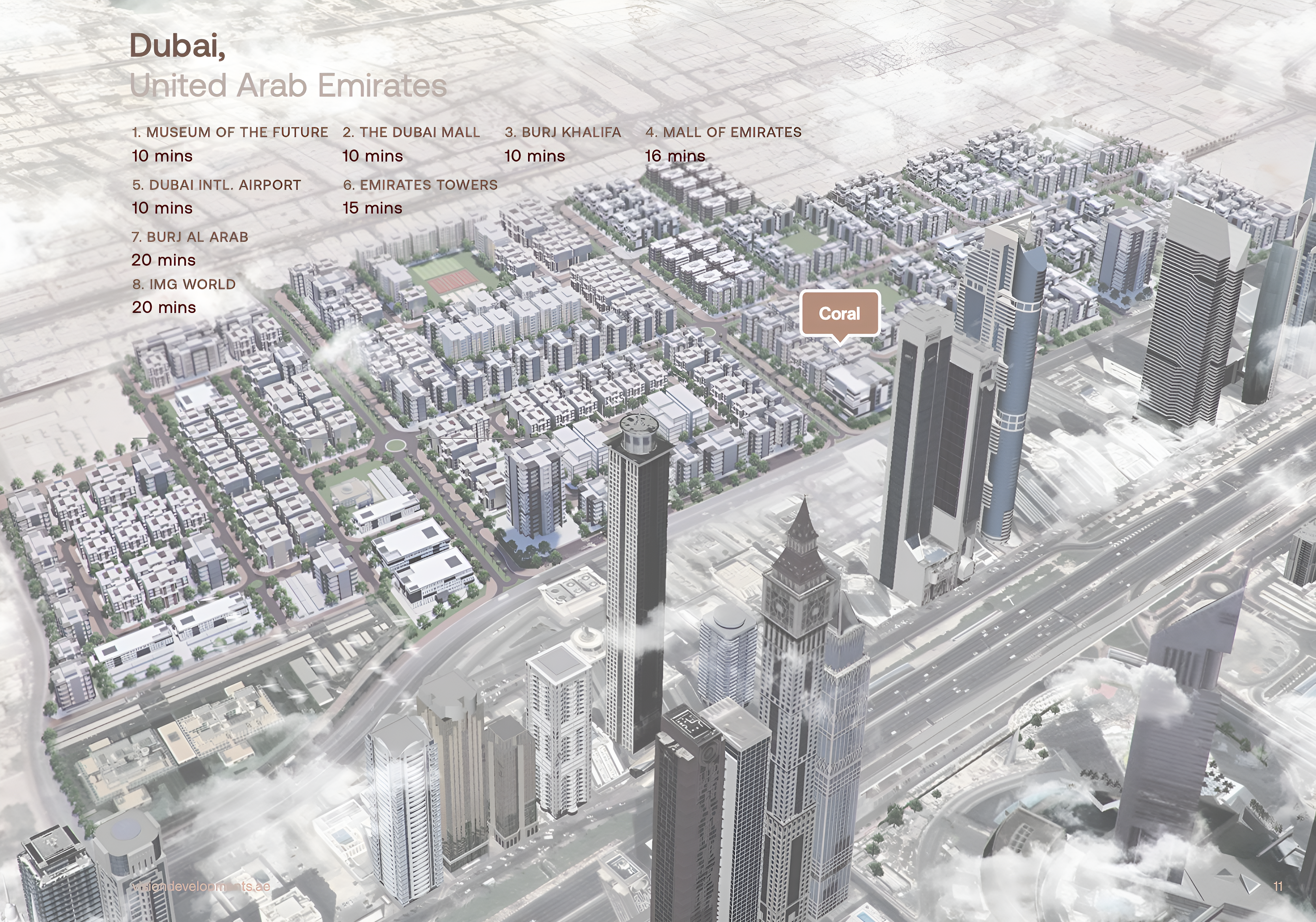 Strategically nestled between the serene shores of Jumeirah and the bustling Sheikh Zayed Road, Coral By Vision boasts an unparalleled location, offering residents the best of both worlds. Enjoy effortless connectivity to Dubai's most iconic landmarks and essential hubs. World-class shopping and entertainment at Dubai Mall are a mere 11-minute drive, while the luxurious beaches and vibrant lifestyle of Palm Jumeirah are just 23 minutes away. Experience the timeless grandeur of Burj Al Arab in 21 minutes, or immerse yourself in the dynamic dining and leisure options at The Walk at JBR, reachable in 27 minutes. For international travelers, Dubai International Airport is 31 minutes away, and Al Maktoum International Airport provides further convenience at a 46-minute drive.