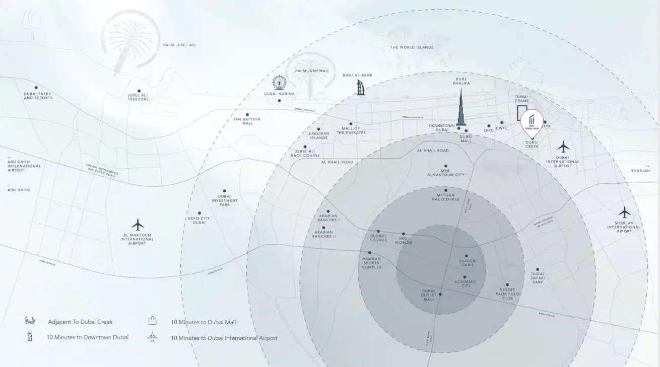 Strategically situated in Al Jaddaf, Iraz Creek View boasts a prime address that ensures convenience and connectivity. Residents will enjoy immediate access to three lush gardens, a picturesque 10 km canal walkway perfect for leisurely strolls, and a dedicated jogging track. The captivating canal views are complemented by the practicality of instant water taxi access nearby and a mere 5-minute walk to the Metro Station. Downtown Dubai and Dubai International Airport are both just a 10-minute drive away, placing the city's iconic landmarks and international gateways within effortless reach. This unique locale offers the peace of a waterside retreat without compromising on urban accessibility.