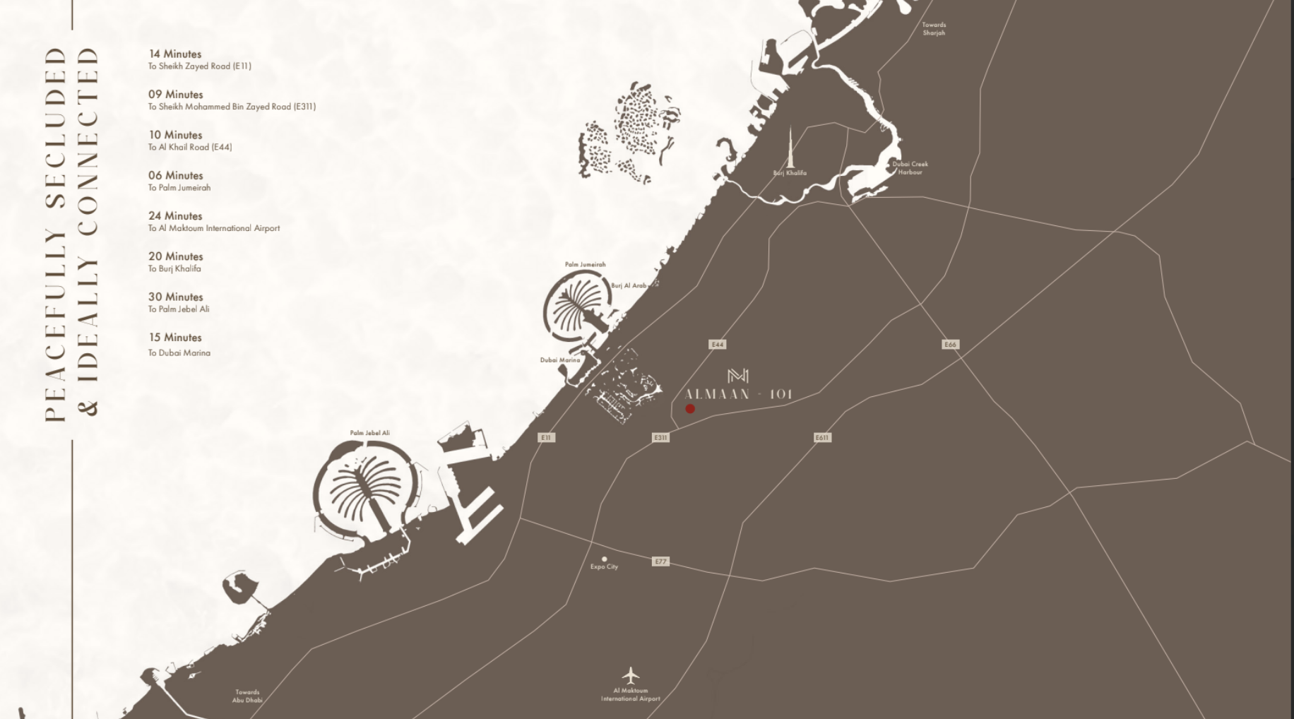 The architectural philosophy of Almaan 101 is one of modern elegance and timeless appeal. The building’s clean-lined façade is a testament to balanced proportions and premium material selection, designed to maximize natural light. Interiors are a masterclass in understated luxury, balancing contemporary aesthetics with warm, inviting finishes. Every residence showcases meticulous attention to detail, from polished travertine flooring in common areas and striking Roso Levanto marble accents, to champagne-toned metal detailing and custom lighting that enhances ambiance. Unique design elements like curved bronze glass windows and fluted travertine wall textures add depth and character, ensuring a home that feels both refined and exceptionally comfortable.