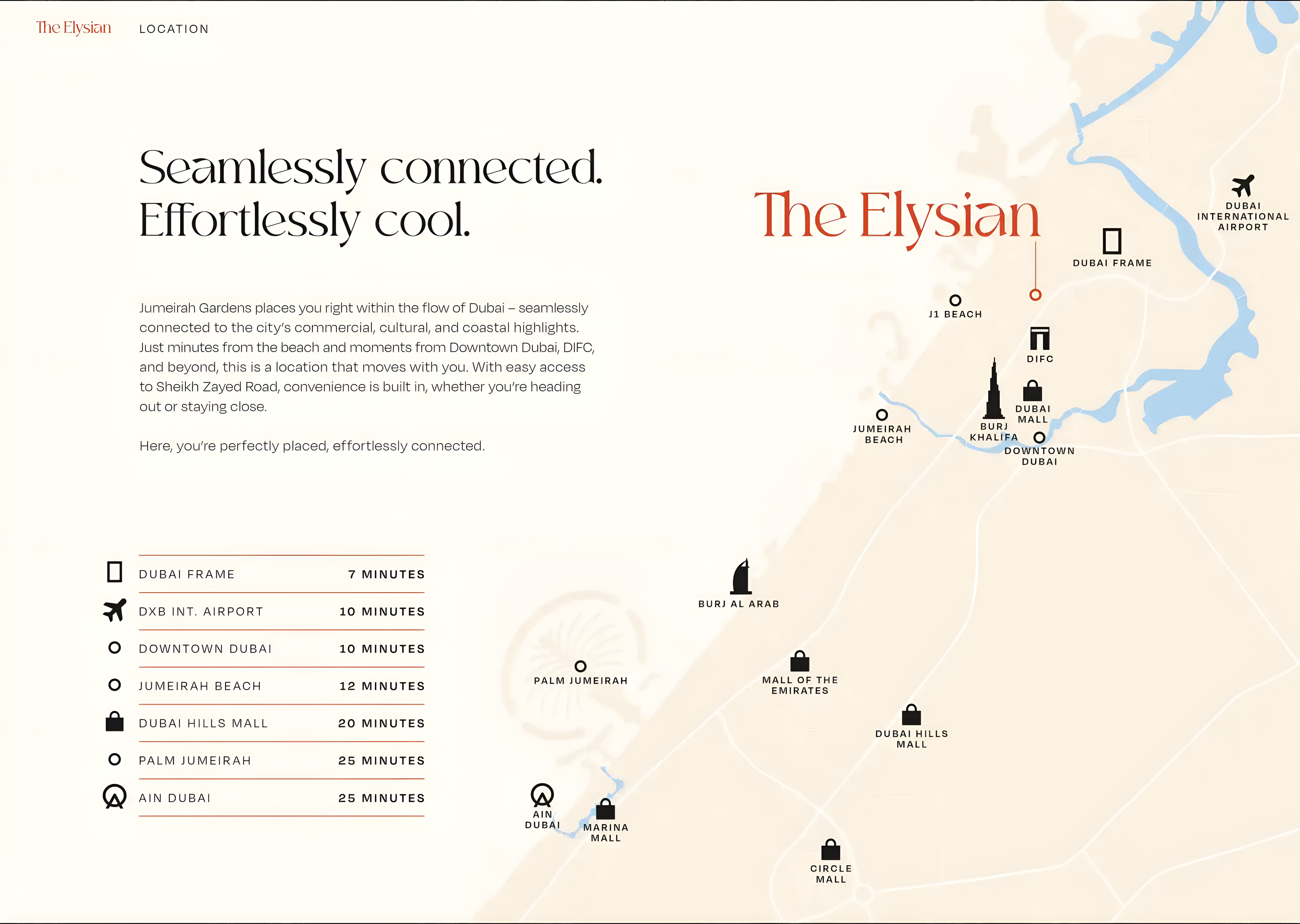 Strategically positioned, The Elysian Residence offers residents unparalleled connectivity and convenience. Enjoy effortless access to Sheikh Zayed Road, ensuring swift commutes across the city, while multiple metro stations are just minutes away. The iconic Jumeirah Beach, with its pristine sands and leisure opportunities, is a short drive, as are the bustling financial and business hubs of DIFC and Business Bay. For a taste of authentic Dubai, traditional souks and local markets are within walking distance, inviting cultural immersion. Furthermore, residents are ideally placed to explore renowned landmarks such as the Jumeirah Mosque, the futuristic Museum of The Future, Dubai Garden Glow, World Trade Centre, the vibrant Downtown Dubai, and the chic La Mer Beach.