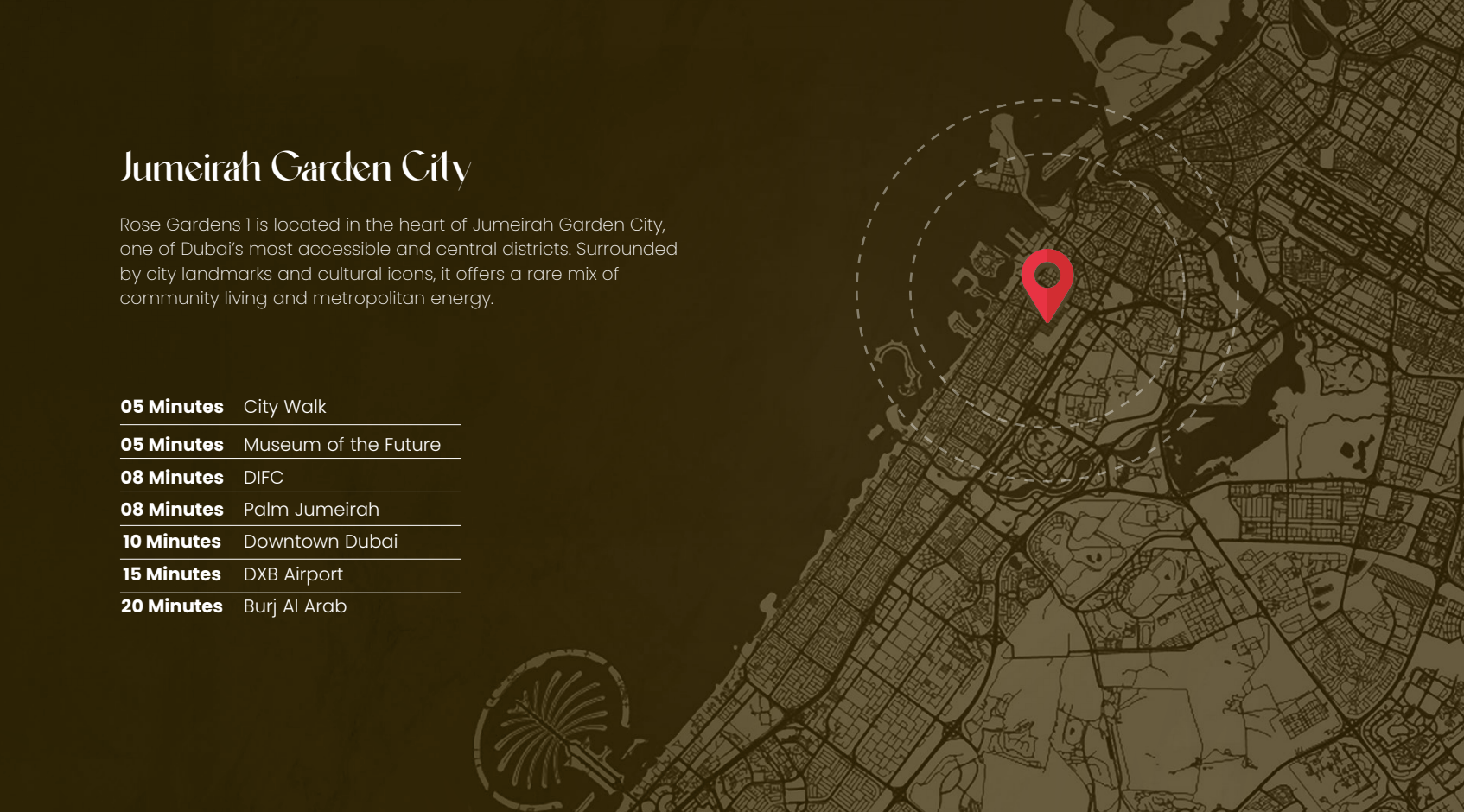 The strategic location of Rose Gardens 1 places you at the epicentre of Dubai's vibrant heartbeat. Enjoy seamless connectivity to the city's most iconic landmarks: the majestic Burj Khalifa is a mere 10-minute drive, the world-renowned Dubai Mall just 12 minutes away, and Dubai International Airport can be reached in a convenient 20 minutes. This prime address ensures that everything you desire, from world-class entertainment and dining to business hubs and travel, is always within easy reach, establishing Jumeirah Garden City as an ideal locale for a refined urban existence.