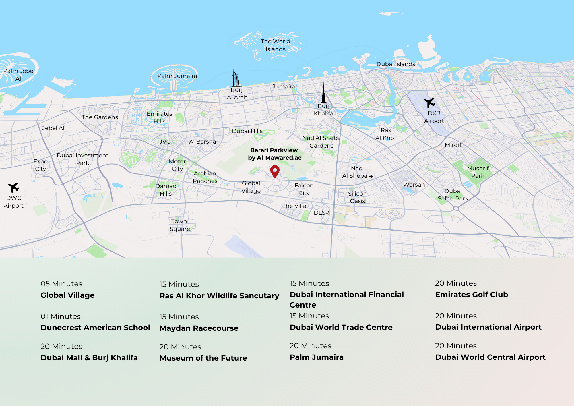 Barari Parkview’s prime location ensures seamless connectivity to Dubai’s most iconic attractions, business hubs, and leisure destinations, while creating a peaceful haven away from the bustling pace. Imagine starting your day surrounded by lush green landscapes, then effortlessly transitioning to the dynamic pulse of the city – this is the unique lifestyle proposition of Barari Parkview.
