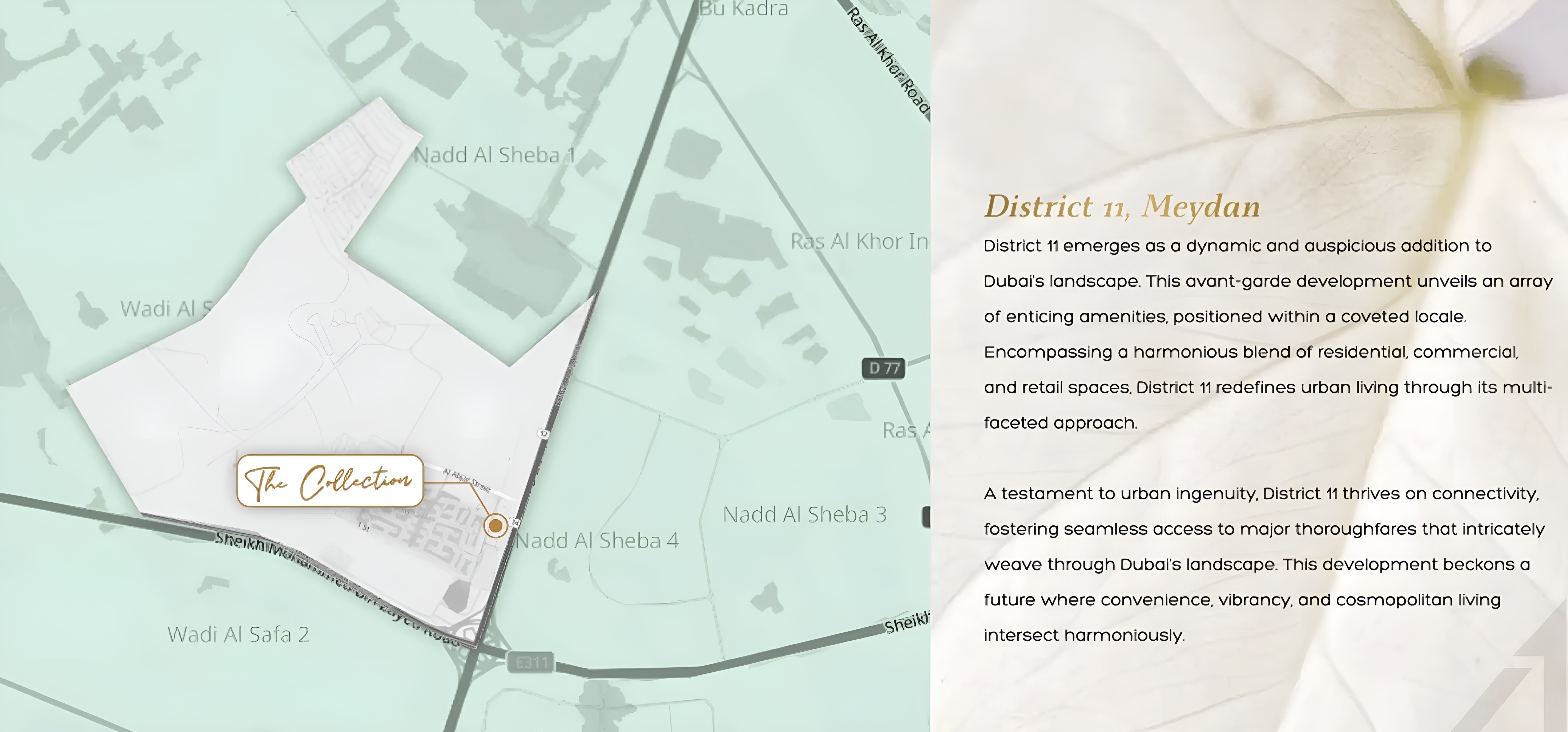 Nestled in one of Dubai's most coveted and meticulously planned communities, The Collection offers residents the perfect fusion of serene tranquility and vibrant urban connectivity. District 11 is celebrated for its lush landscapes, picturesque water features, and an abundance of world-class civic amenities. Here, you'll enjoy the peace of a verdant retreat while remaining effortlessly connected to Dubai's major business hubs, entertainment destinations, and pristine beaches. The strategic location ensures swift access to key arterial roads, placing the best of Dubai within easy reach.