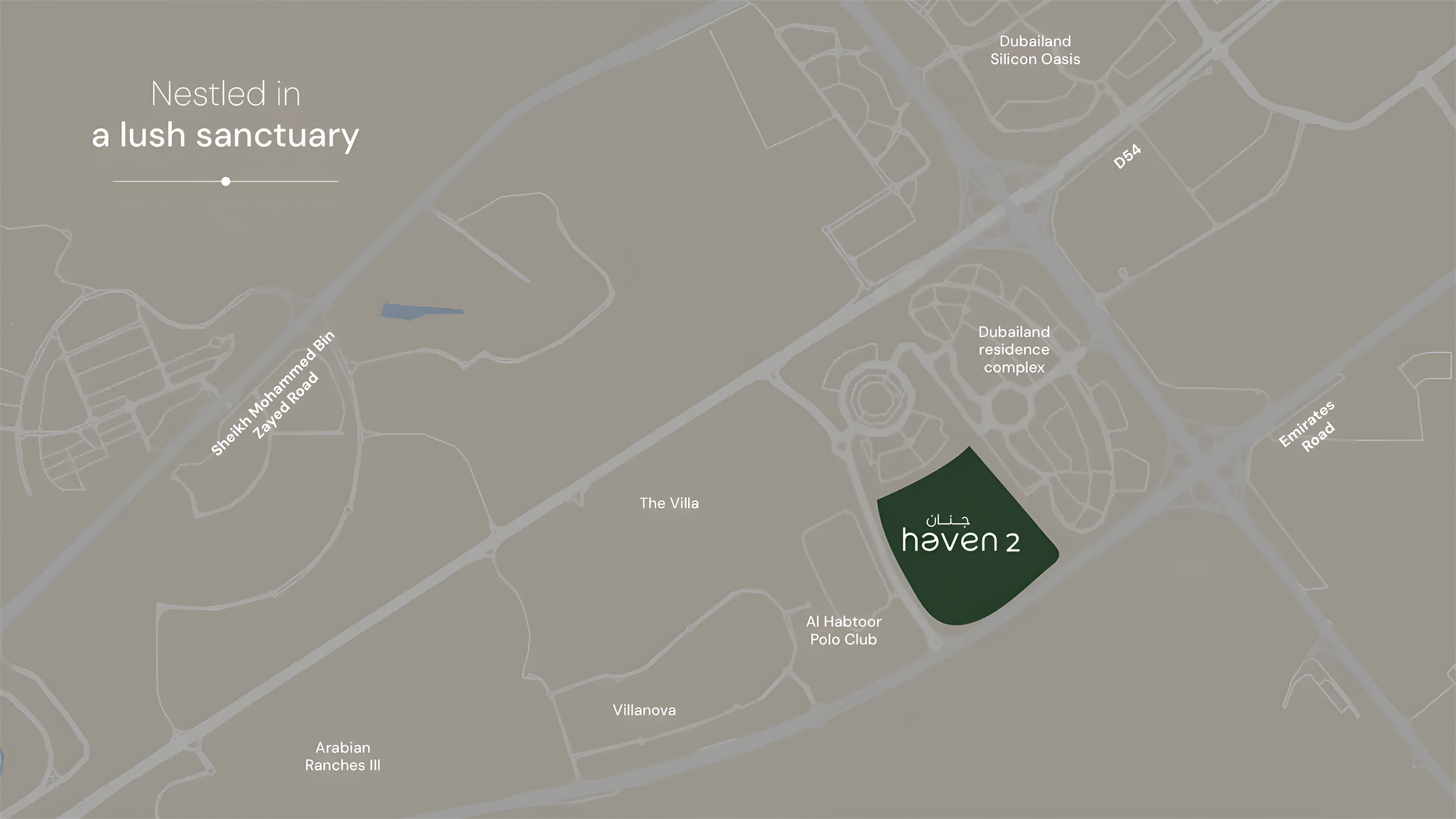 Strategically located in Dubailand, directly opposite the prestigious Al Habtoor Polo Resort, Haven Phase 2 boasts superb connectivity. Residents will enjoy effortless access to key arterial routes such as E611, Dubai-Al Ain Road, and Sheikh Mohammed Bin Zayed Road, ensuring swift commutes to major destinations. Reach Downtown Dubai, DIFC, Business Bay, and Al Maktoum International Airport within minutes. The community's prime position also places it near popular attractions like Arabian Ranches, Nad Al Sheba, IMG World of Adventure, and Global Village, offering an abundance of shopping, dining, entertainment, and essential services right at your doorstep.