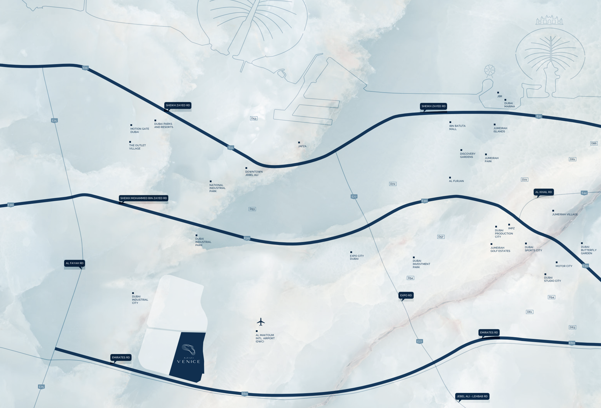 Strategically positioned in Dubai South, one of the city's fastest-growing urban zones, Azizi Venice 13 offers residents an enviable balance of serene waterfront living and seamless connectivity. Its prime location ensures direct access to major business, leisure, and travel hubs: a mere 15 minutes to Al Maktoum International Airport, 25 minutes to Dubai Marina, 30 minutes to Downtown Dubai, and 35 minutes to Dubai International Airport. Direct connectivity to Emirates Road, coupled with proximity to Expo City and Dubai South’s burgeoning business districts, underscores its strategic value and promises an effortlessly connected lifestyle.