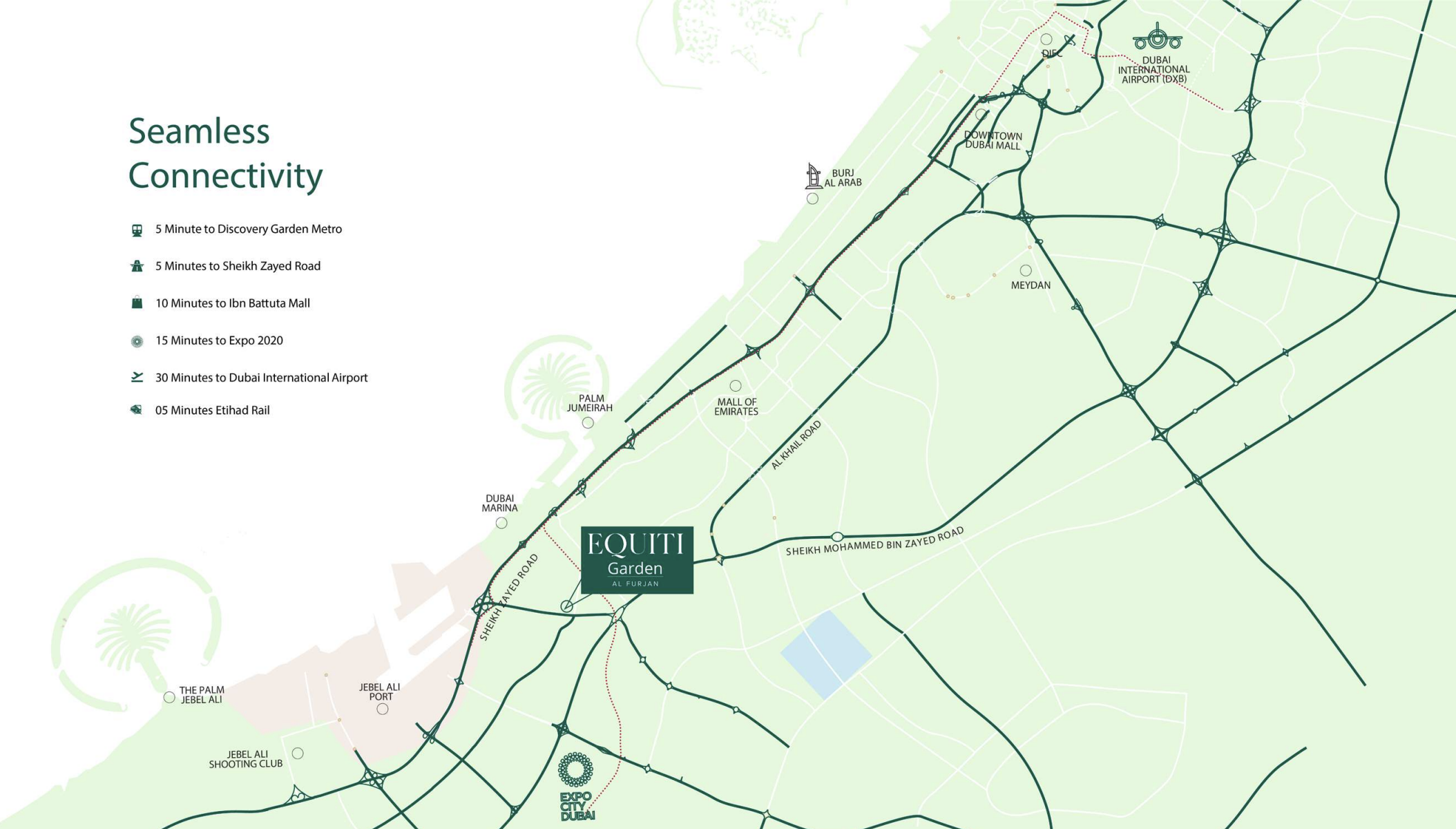 Strategically located in Jabal Ali First, Equiti Garden boasts exceptional connectivity that defines convenience. Residents will enjoy swift access to major arterial roads such as Sheikh Zayed Road and Al Yalayis Road, ensuring seamless commutes across the city. The UAE Exchange Metro Station is a mere 5-minute drive, while the iconic Ibn Battuta Mall is just 10 minutes away, offering world-class retail and entertainment options. For international travelers, Al Maktoum International Airport is conveniently reachable within 20 minutes, cementing Equiti Garden's position as a hub of accessibility and tranquility.