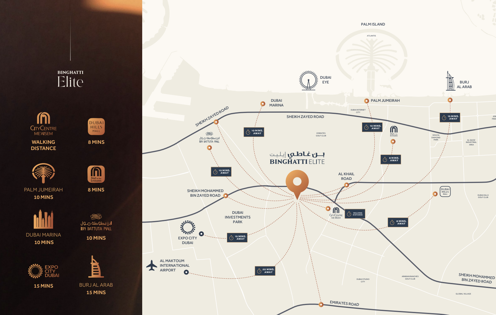 Strategically nestled within IMPZ, one of Dubai's most dynamic and rapidly evolving neighborhoods, Binghatti Elite boasts an enviable location that marries accessibility with exclusivity. Residents will benefit from seamless connectivity to major highways, ensuring swift access to the emirate's key business districts and leisure attractions. Major points of interest are mere minutes away, including the innovation hub of Expo City and the bustling waterfront promenade of Dubai Marina, renowned for its world-class dining, entertainment, and retail options. Everyday conveniences are also within easy reach, with prominent shopping destinations like City Centre Me'aisem and Ibn Battuta Mall offering a plethora of retail and culinary experiences.