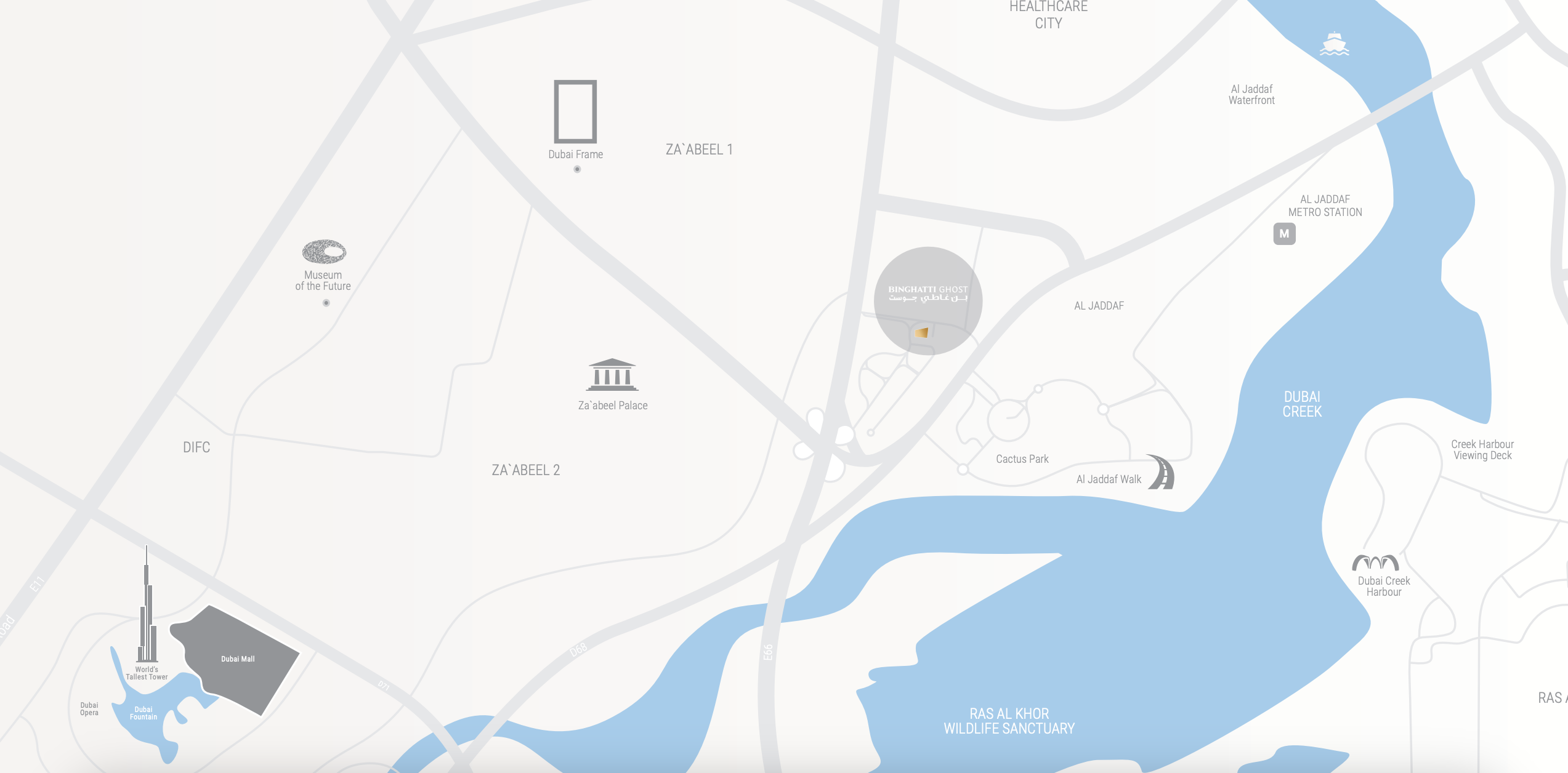 Binghatti Ghost boasts an enviable address that perfectly balances tranquility with urban convenience. Situated mere moments from the picturesque Dubai Creek, residents will enjoy effortless access to some of Dubai’s most iconic destinations:
