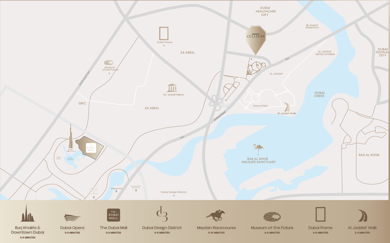 Binghatti Cullinan, a signature development by the esteemed Binghatti Developers, redefines luxury living in Dubai's burgeoning Al Jaddaf district. This architectural masterpiece offers an exclusive collection of off-plan luxury apartments, poised to become a new landmark blending sophisticated design with unparalleled urban convenience. Strategically located, Binghatti Cullinan places residents at the nexus of connectivity, mere minutes away from the iconic Downtown Dubai, the world-renowned Dubai Mall, and just a kilometer from the Al Jaddaf Metro Station, ensuring seamless access to the city's vibrant heart and key business hubs.