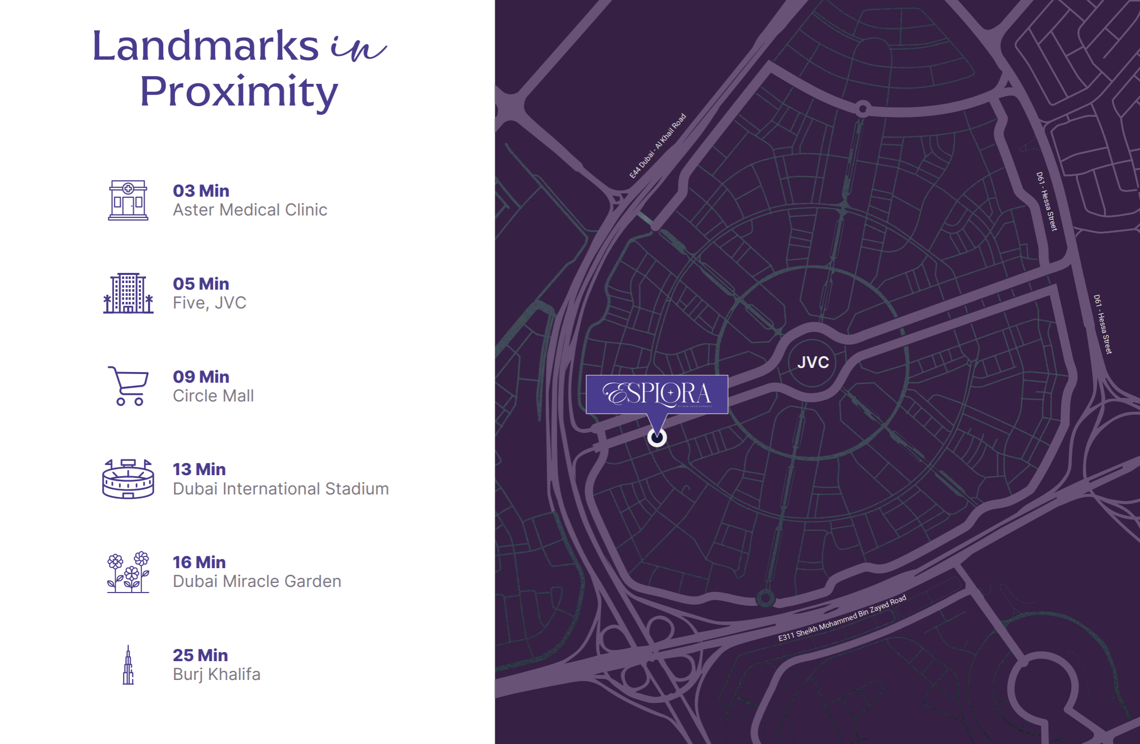 Strategically located in one of Dubai’s fastest-growing communities, Esplora offers unparalleled connectivity while maintaining a tranquil suburban feel. Residents will find themselves at the epicentre of convenience, with key destinations easily accessible. Downtown Dubai and Business Bay are merely a 25-minute drive away, ensuring effortless commutes for business professionals and convenient access to the city’s vibrant leisure and entertainment hubs. Everyday essentials and recreational pursuits are even closer, with Circle Mall and JVC Community Park just minutes on foot. The surrounding area also boasts proximity to leading nurseries, schools, and sports facilities, making it an ideal choice for families.