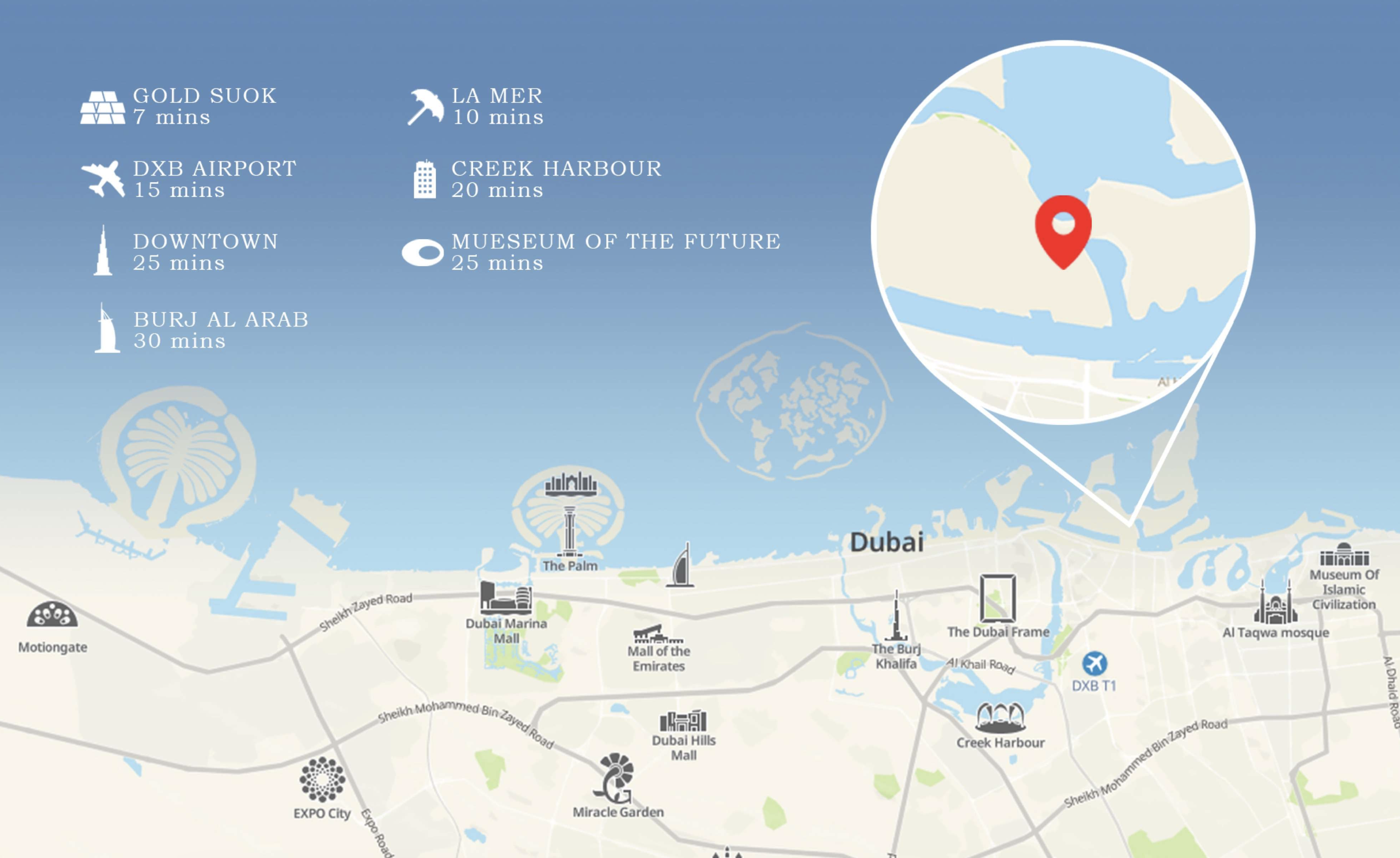 Strategically positioned on the sought-after Dubai Islands, Capital Horizon Terraces grants residents the perfect balance of peaceful retreat and seamless connectivity. Its prime location ensures that Dubai's most iconic landmarks are always within effortless reach: Dubai Creek Harbour is just 8 minutes away, Downtown Dubai a mere 12 minutes, and Dubai International Airport can be reached in 18 minutes. Enjoy quick access to Dubai Marina in 15 minutes, Festival City Mall in 10 minutes, and the pristine Jumeirah Beach in 20 minutes, making everyday commutes and leisure excursions incredibly convenient.