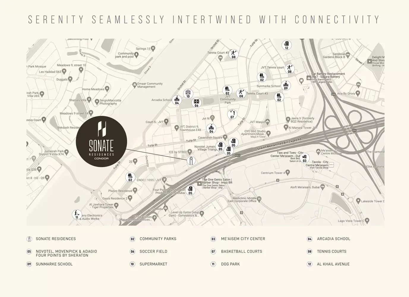 Strategically located in the highly sought-after JVT, Sonate Residences boasts unparalleled connectivity. Residents will enjoy effortless access to major arterial roads such as Al Khail Road and Sheikh Mohammed Bin Zayed Road, facilitating seamless commutes to Dubai's key business hubs and leisure destinations. The community itself is a verdant oasis, brimming with serene parks, sports courts, charming cafes, and essential retail outlets, fostering a family-friendly atmosphere that balances tranquility with urban convenience. Nearby landmarks include Dubai Studio City and Jumeirah Village Circle, placing entertainment and daily necessities within easy reach.