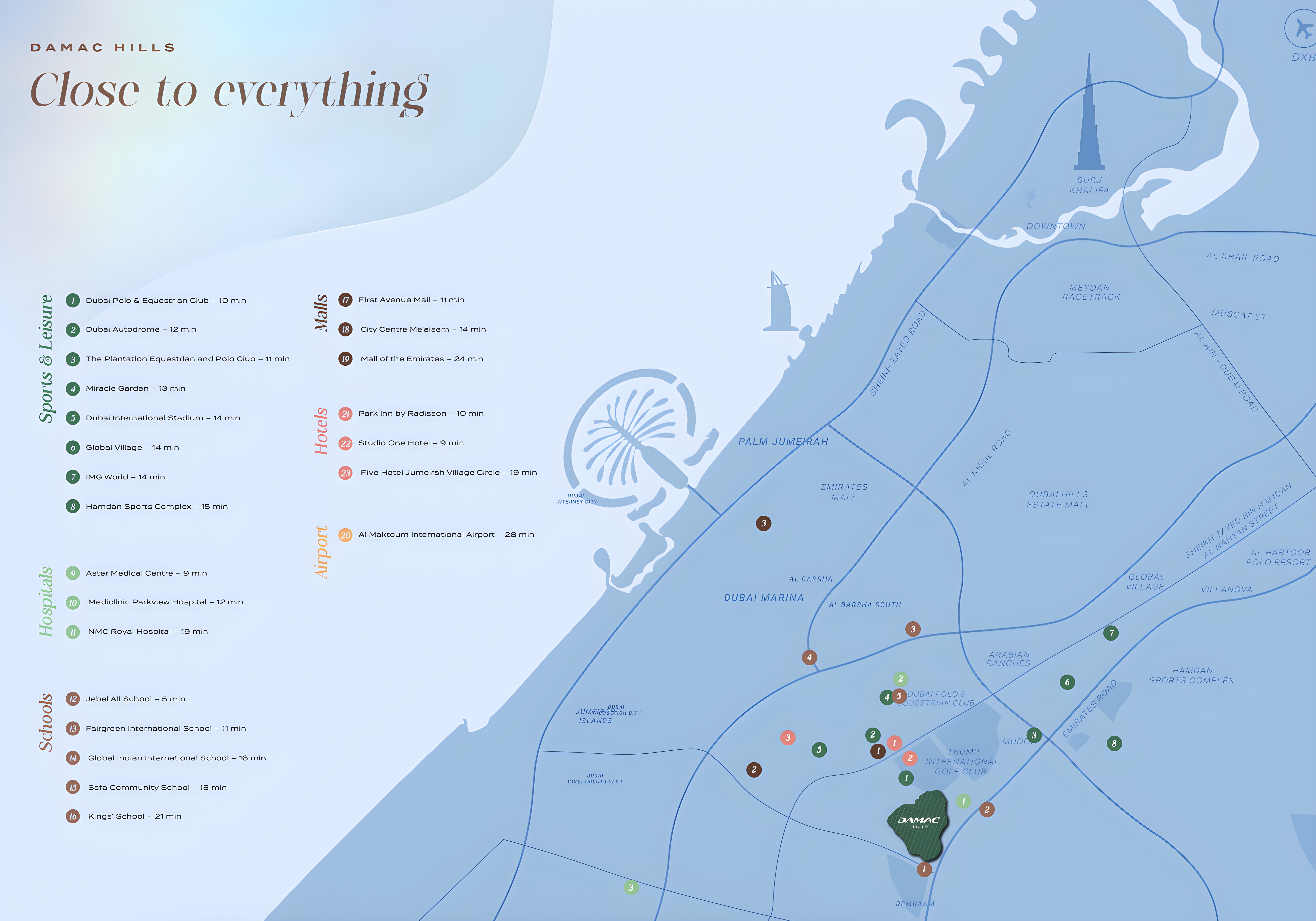 Strategically located within DubaiLand, Damac District boasts exceptional connectivity to Dubai's most celebrated landmarks. Enjoy swift access to Dubai Mall, Palm Jumeirah, Burj Al Arab, and The Walk JBR, placing the city's vibrant pulse within easy reach. Both Dubai International Airport and Al Maktoum Airport are conveniently accessible, making it an ideal choice for global citizens and frequent travelers.