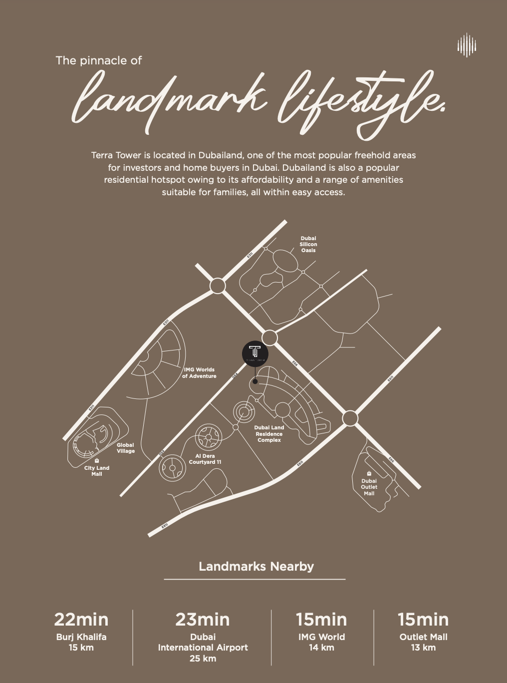 Nestled in the heart of Dubailand, Terra Tower residents benefit from an exceptional location that perfectly balances serene suburban charm with seamless connectivity to Dubai’s bustling urban core. Dubailand is celebrated for its vibrant, family-friendly environment, boasting an array of world-class theme parks, diverse retail destinations, and abundant leisure activities. This thriving district appeals equally to dynamic professionals and growing families, ensuring a fulfilling lifestyle for all. The tower's strategic proximity to essential amenities and major transport arteries significantly enhances convenience, simplifying daily commutes and access to city hotspots.
