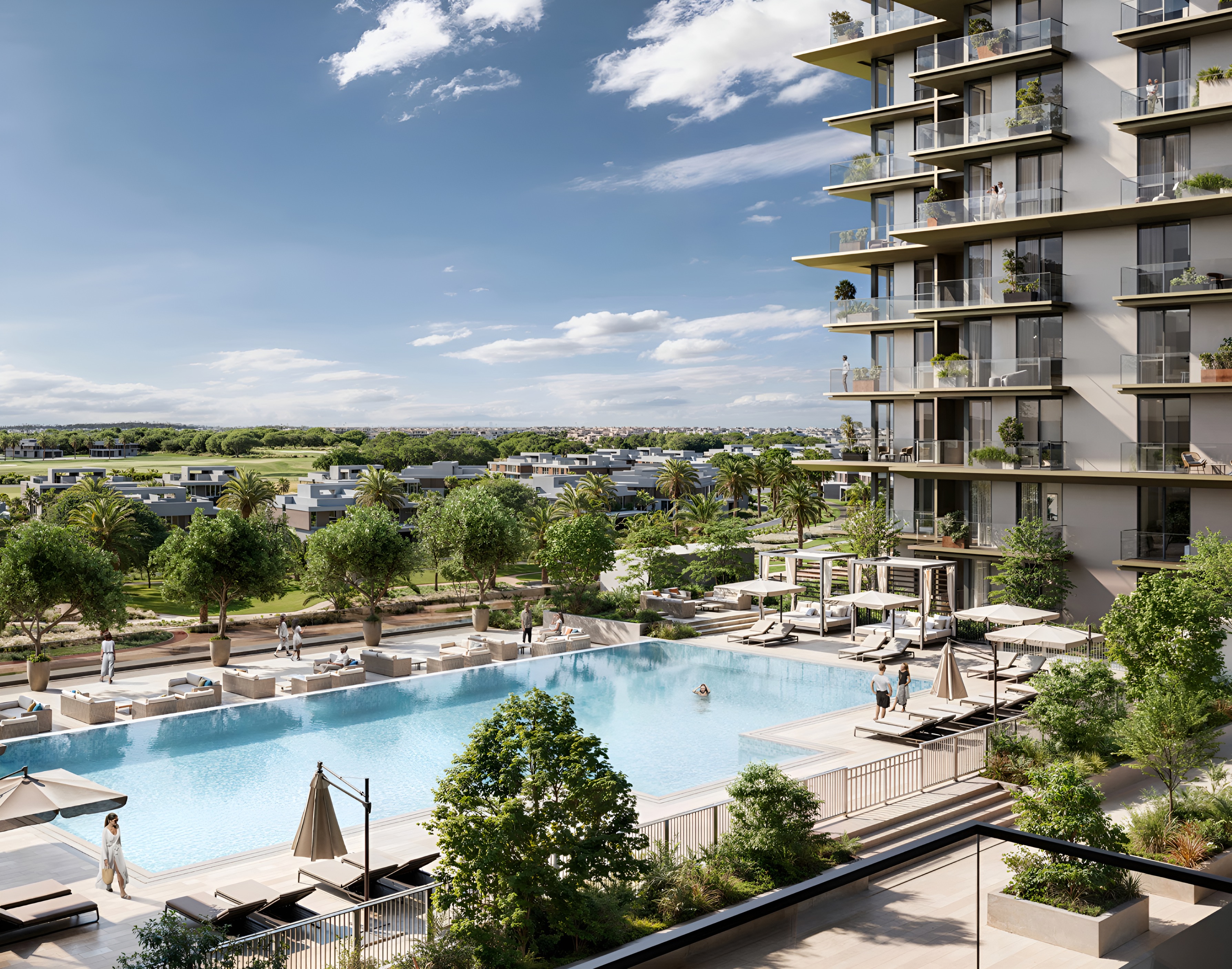 Each residence at Club Place is a testament to Emaar’s commitment to luxury and comfort. Step into apartments featuring generous floor plans, adorned with high-end finishes and an aesthetic that is both modern and inviting. Large windows frame captivating vistas, with many offering breathtaking views of the lush championship golf course, creating a private sanctuary where every day feels like a luxurious escape. The three distinctive buildings boast stunning contemporary architecture, thoughtfully integrated with immaculately manicured lawns and verdant communal spaces, enhancing the overall living experience.
