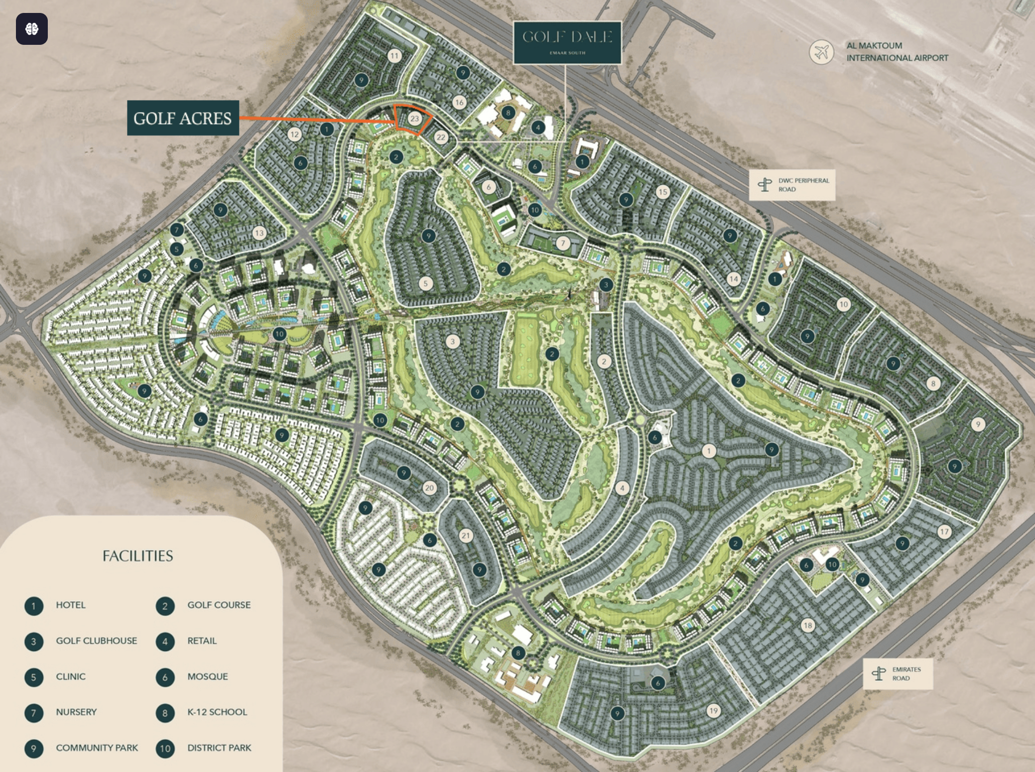 Golf Acres enjoys a strategic location within Emaar South, offering residents the best of both worlds. Immerse yourself in a peaceful environment while remaining exceptionally well-connected to Dubai's vibrant hubs: