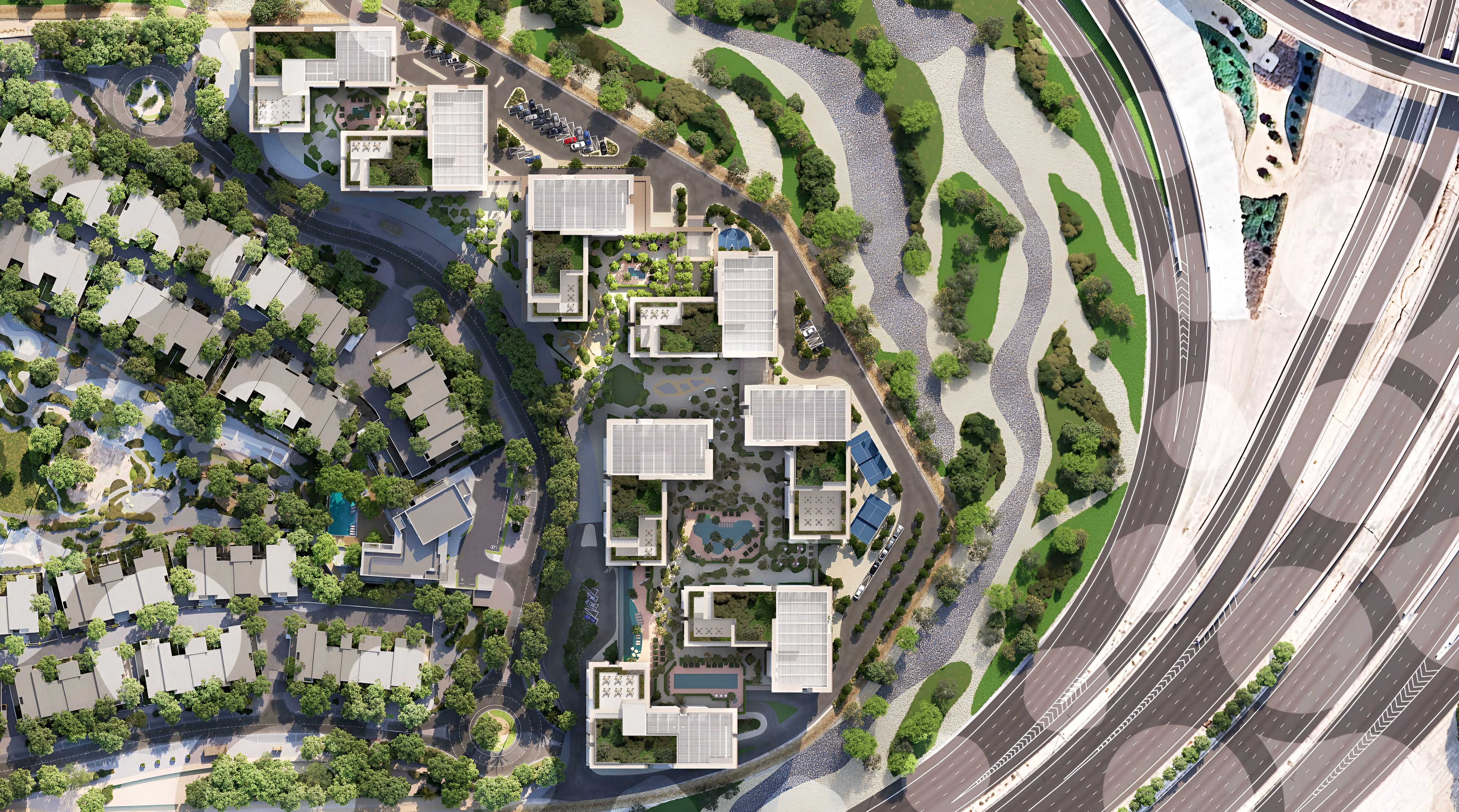 Dana Expo Valley Views is meticulously designed for those who seek a balanced existence where well-being is paramount. The architecture, characterized by graceful mid-rise (13-storey) buildings, employs soothing earth tones and expansive glass windows that ingeniously invite natural light and the breathtaking external environment indoors. This thoughtful integration creates a profound harmony with nature, amplified by beautifully landscaped gardens, serene shaded walkways, and a spectacular central swimming lagoon that meanders through the community, fostering a relaxing atmosphere. Every detail, from the minimalist façade to the conscious use of natural materials in interiors, reflects a deep commitment to mindful living and holistic wellness.