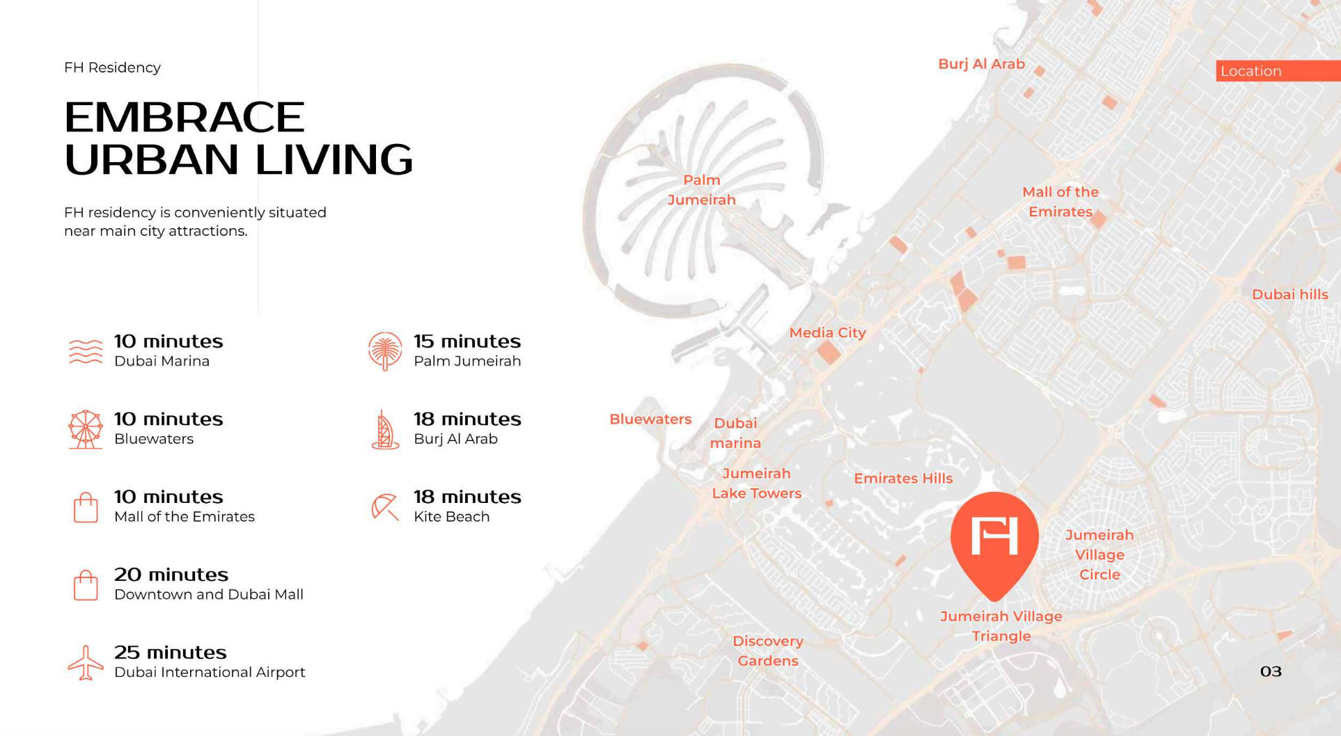 Nestled within the vibrant, family-friendly embrace of JVT, FH Residency offers unparalleled connectivity and convenience. Residents will benefit from swift access to Dubai's major road networks, placing the city's business hubs, leisure destinations, and pristine beaches within effortless reach. The community itself is renowned for its lush green spaces, serene ambiance, and proximity to essential amenities including world-class retail outlets, educational institutions, and healthcare facilities, ensuring a life of ease and accessibility.