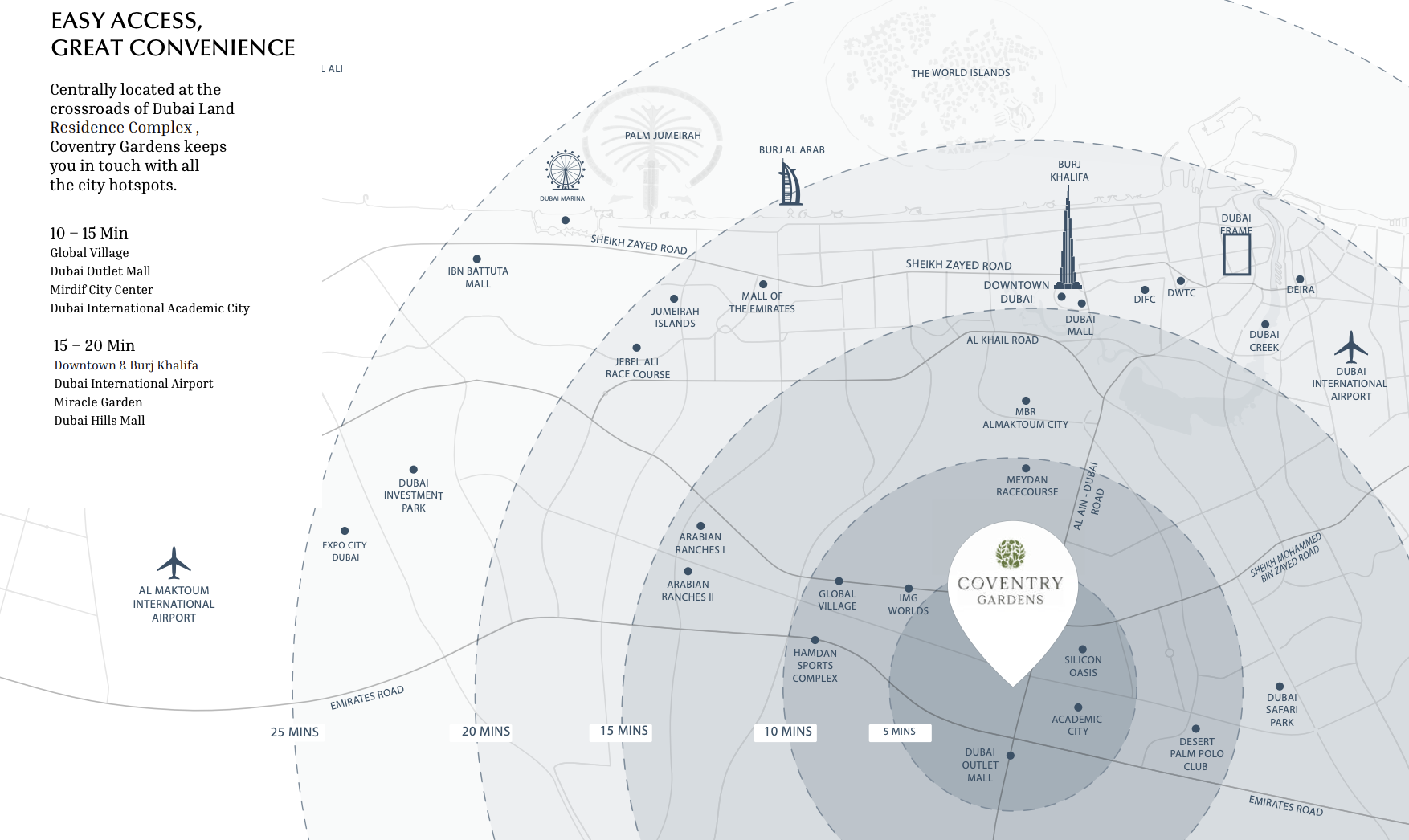 Strategically nestled within the vibrant heart of Dubai Land, Coventry Gardens boasts prime connectivity that places residents at the nexus of the city's most dynamic districts. Enjoy effortless access to major highways, ensuring swift commutes to Dubai's bustling business hubs, world-renowned shopping destinations, and a comprehensive network of schools and healthcare facilities. The proximity to entertainment landmarks like Global Village further enhances the lifestyle offerings, promising a blend of convenience and leisure right at your doorstep.