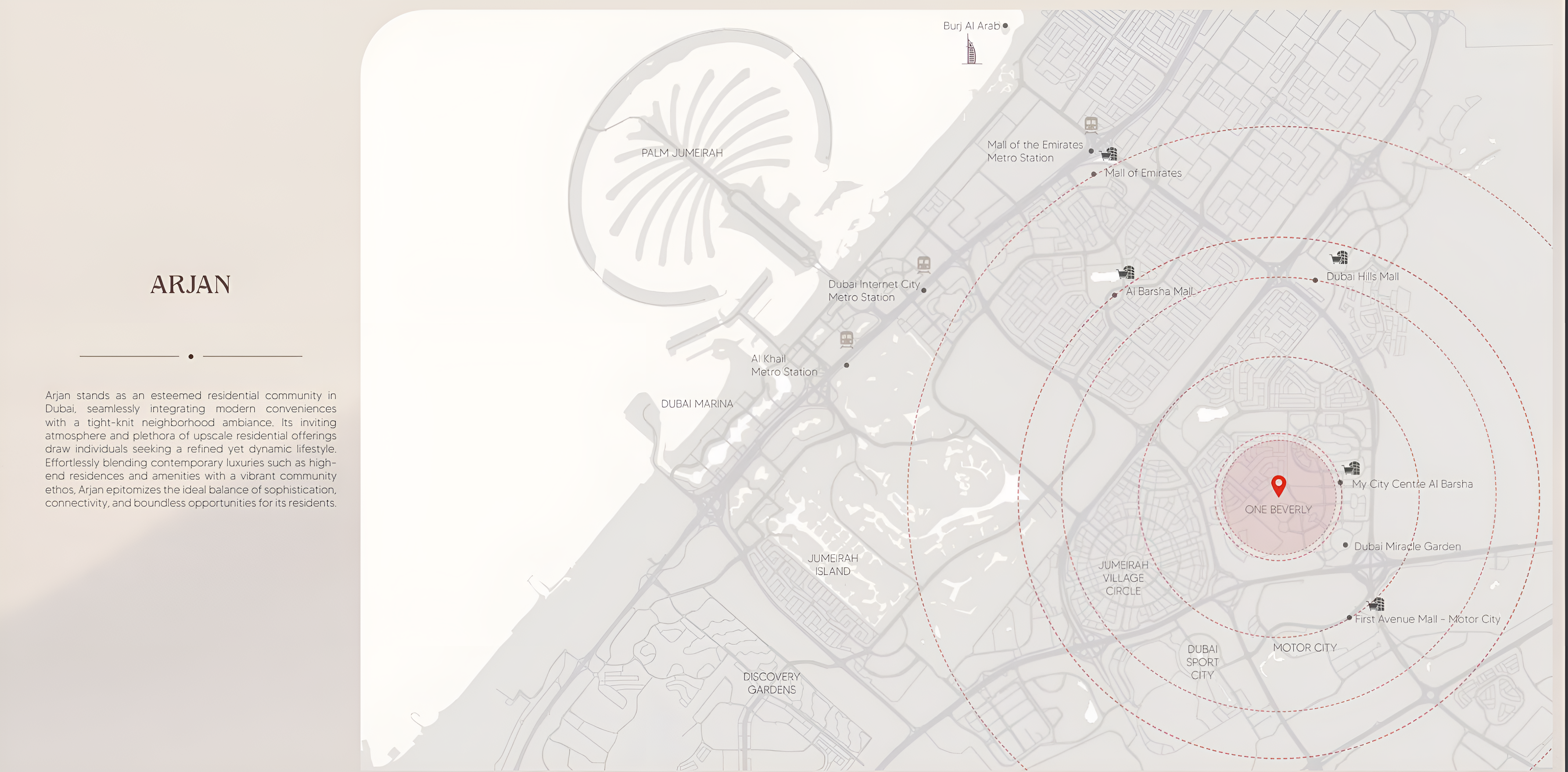 Strategically positioned in the heart of Arjan, One Beverly boasts a prime address offering exceptional connectivity. Residents will enjoy effortless access to major highways, seamless transportation networks, and a wealth of essential conveniences. Renowned educational institutions, world-class healthcare facilities, and vibrant shopping destinations are just moments away. Moreover, the development's proximity to iconic landmarks like the enchanting Miracle Garden and the captivating Dubai Butterfly Garden ensures a lifestyle rich in leisure and natural beauty.