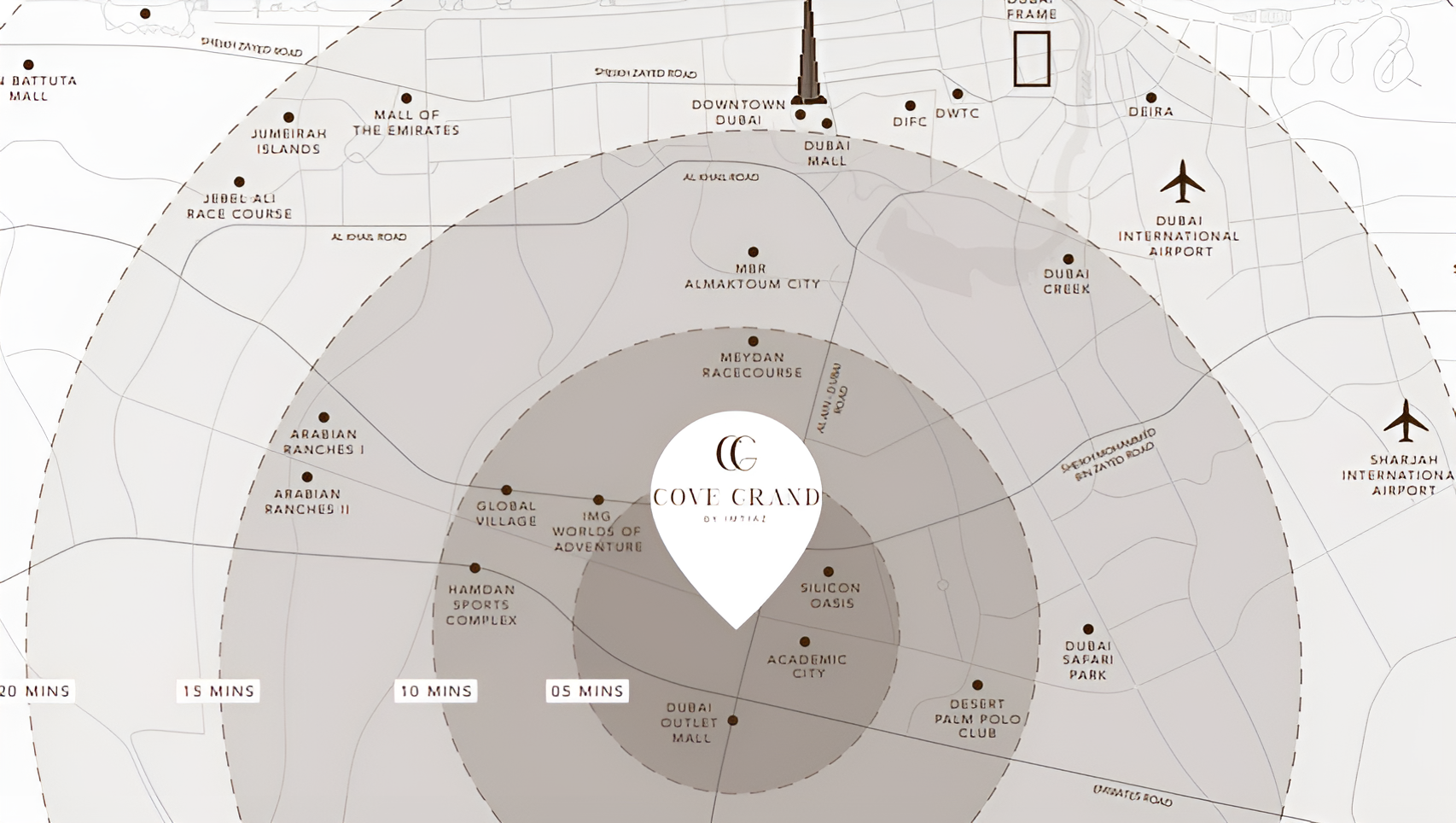 Strategically positioned, Cove Grand offers residents the perfect balance of serene living and dynamic urban connectivity. Its prime location ensures unparalleled accessibility to Dubai's key destinations. Downtown Dubai, the city's vibrant heart for business and leisure, is merely a fifteen-minute drive away. For international travel, Dubai International Airport can be reached in just twenty minutes, while the bustling hub of education and technology, Dubai Silicon Oasis, is a convenient ten minutes away. Seamless access to major arterial routes like Al Ain Road and Sheikh Mohammed Bin Zayed Road further enhances connectivity, placing residents minutes from essential retail centers, esteemed educational institutions, and diverse leisure attractions.