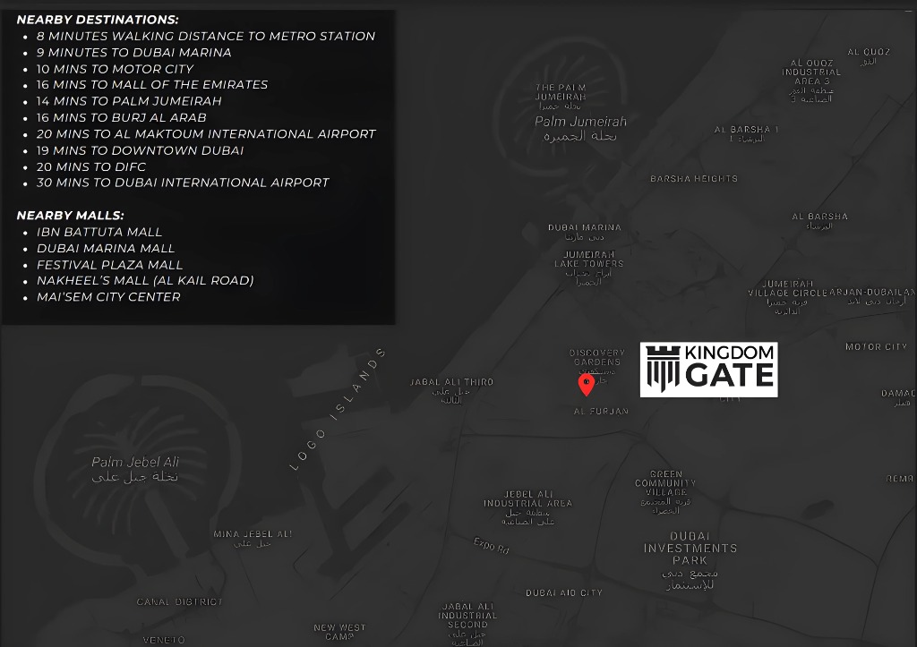 Strategically positioned in Al Furjan, Kingdom Gate grants residents effortless access to Dubai's essential arteries, including Sheikh Zayed Road and Al Khail Road. This prime location ensures swift commutes to major business districts, world-class leisure attractions, top-tier educational institutions, and leading healthcare facilities. Enjoy the rare combination of a serene community atmosphere with the vibrant pulse of the city always within reach, further enhanced by excellent proximity to Dubai Metro stations and public transport networks.
