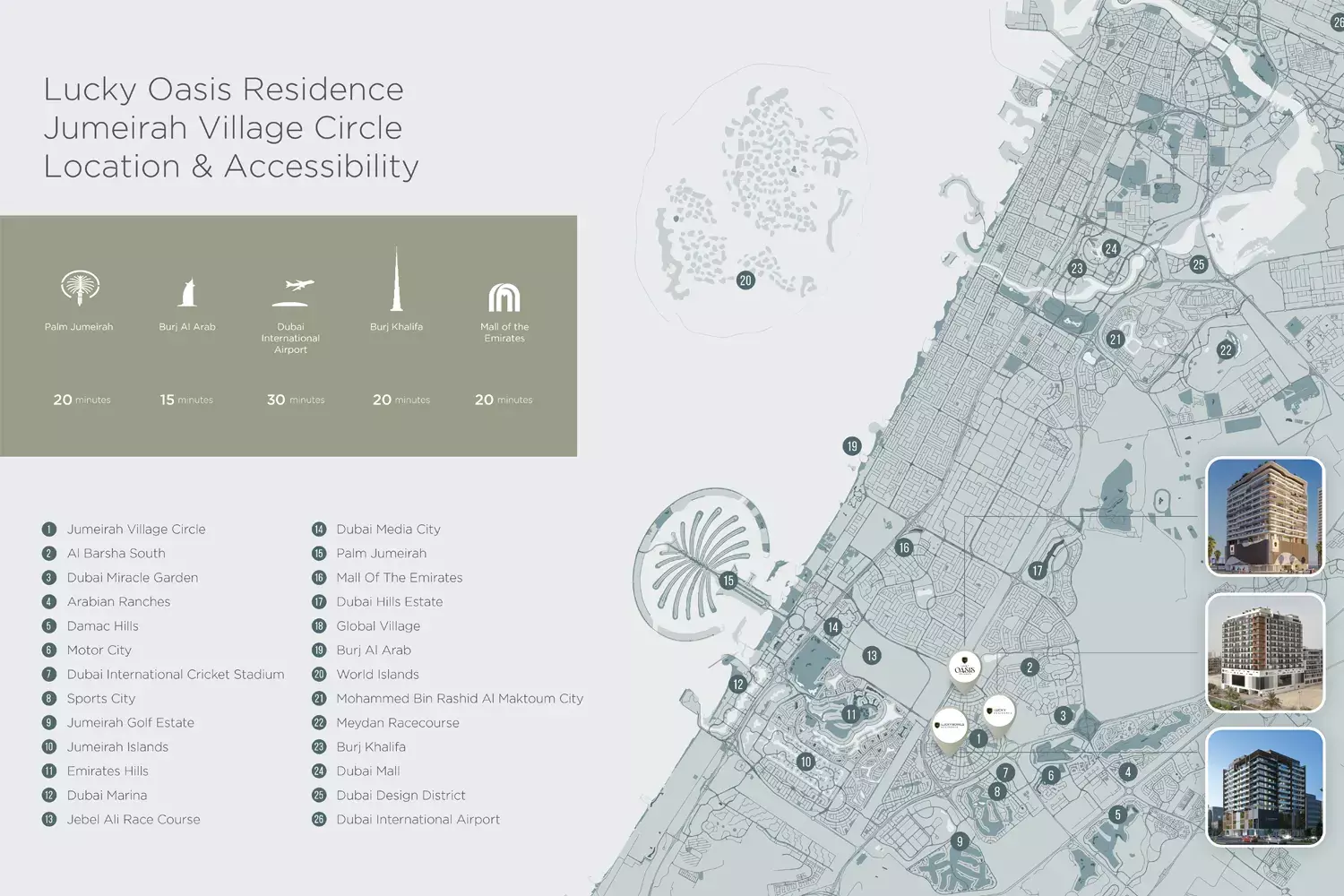 Strategically nestled in JVC, Lucky Oasis Residence benefits from a prime location renowned for its harmonious blend of tranquil community living and lively urban connectivity. Residents will enjoy effortless access to Dubai's major highways, business districts, and leisure attractions, positioning it as an ideal locale for both serene relaxation and dynamic city engagement. This coveted address promises a lifestyle where convenience meets prestige.