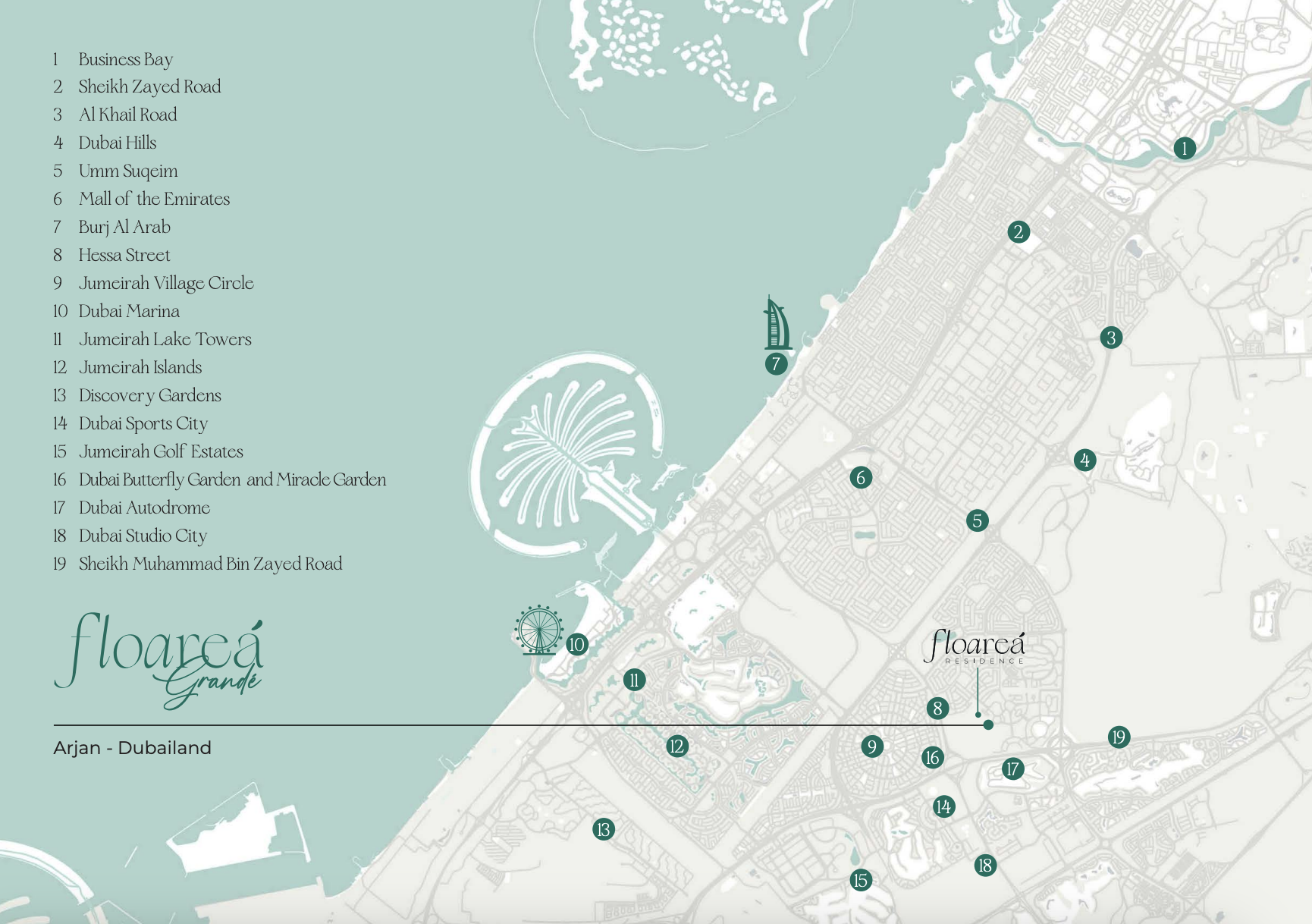 Strategically located, Floarea Grande offers the perfect balance between serene living and immediate access to Dubai’s bustling city life. Residents will benefit from instant proximity to the enchanting Dubai Miracle Garden and the captivating Dubai Butterfly Garden, providing unique leisure opportunities right on their doorstep. Seamless connectivity is assured with easy access to Sheikh Zayed Road, linking you effortlessly to major business hubs, world-class entertainment, and leisure destinations. Furthermore, the development is just minutes away from prominent shopping malls and retail centers, and a short drive from iconic waterfront attractions like Dubai Marina and Palm Jumeirah, placing you at the heart of everything Dubai has to offer.