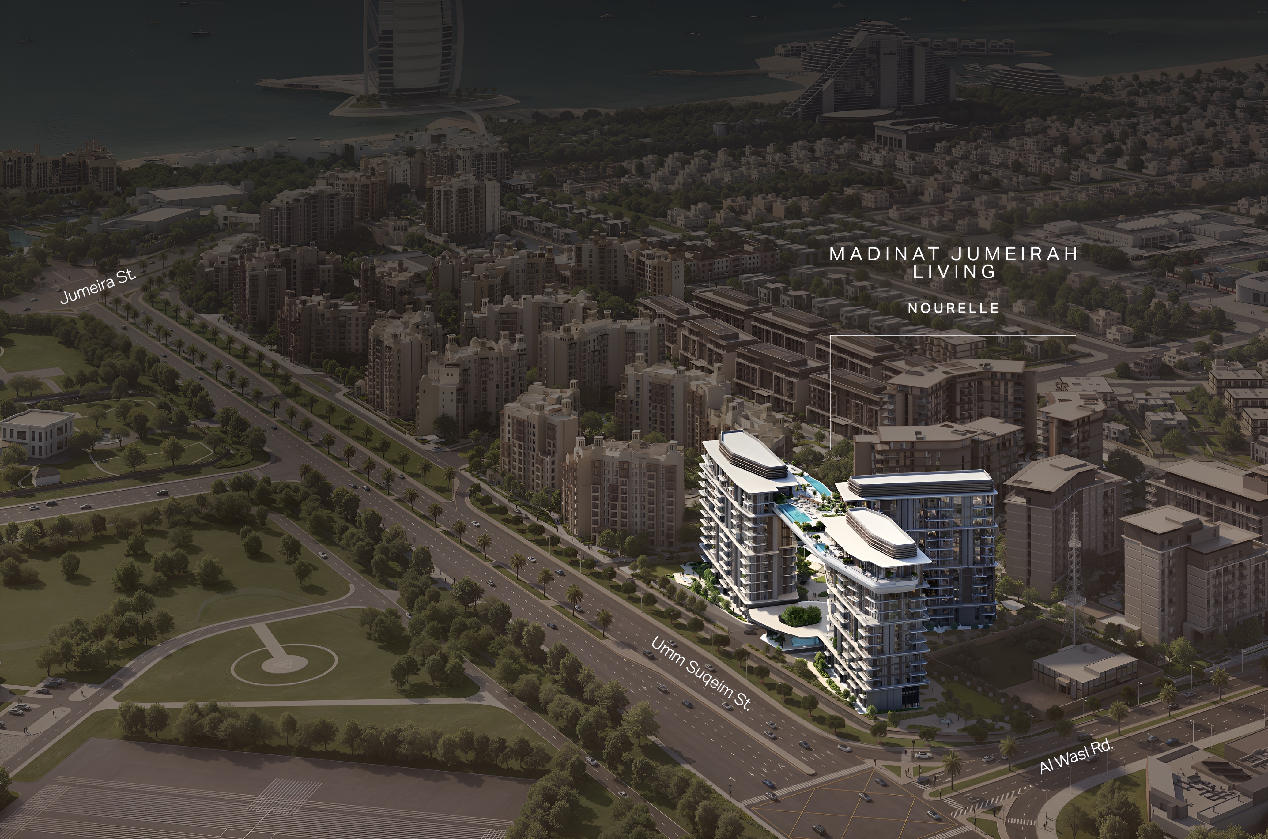 Nestled in the heart of Umm Suqeim, Nourelle boasts an unparalleled location that positions residents at the nexus of tranquility and urban vibrancy. Imagine being mere steps away from the iconic Madinat Jumeirah Resort and Wild Wadi Waterpark, with the majestic Burj Al Arab and the pristine Jumeirah Beach just a short stroll or drive away. This prime setting ensures effortless connectivity, providing swift access to Sheikh Zayed Road and major highways, putting Mall of the Emirates, Dubai Media City, and a plethora of premium schools, fine dining establishments, and retail destinations within easy reach. Nourelle masterfully balances the serene charm of coastal living with the dynamic pulse of Dubai, offering a resort-like atmosphere where every day feels like a retreat.