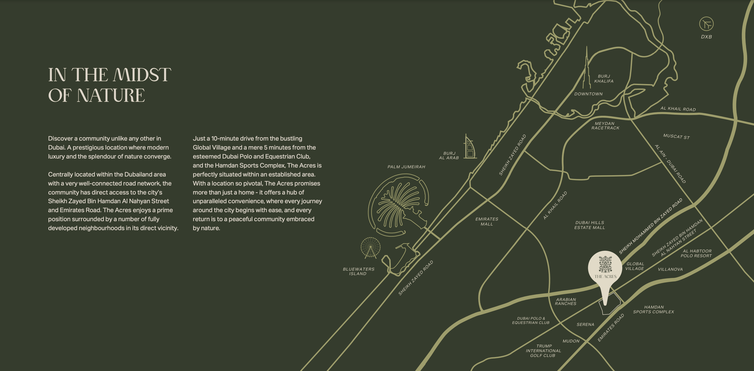 Strategically positioned in the heart of Dubailand, The Acres Phase 2 boasts exceptional connectivity, ensuring residents enjoy both peaceful seclusion and effortless access to Dubai's vibrant urban core. With direct links to major arteries like Sheikh Zayed Bin Hamdan Al Nahyan Street and Emirates Road, key destinations are mere minutes away. Imagine being just 10 minutes from the global spectacle of Global Village and a swift 5-minute drive from the elite Dubai Polo and Equestrian Club. This prime address ensures a perfect equilibrium between a restorative environment and dynamic city life.