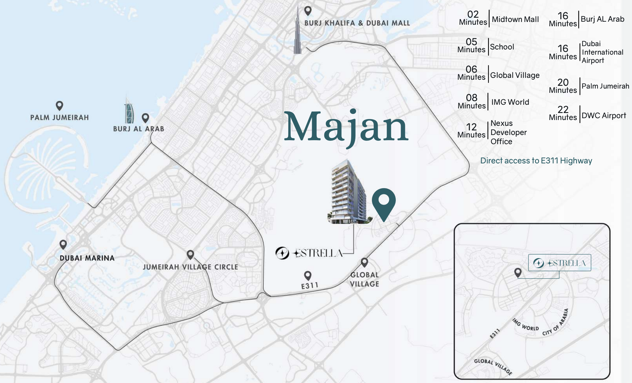 Strategically positioned in Majan, Estrella offers residents exceptional connectivity to the emirate’s most iconic destinations. Enjoy swift access to major highways, placing you just 13.1 km from Dubai’s vibrant city center. The project’s prime location ensures close proximity to burgeoning business districts, reputable educational institutions, and world-class healthcare facilities. Furthermore, leisure and entertainment are always within reach, with attractions like Al Barari and Dubai’s premier entertainment hubs just a short drive away, promising a lifestyle of convenience and excitement.