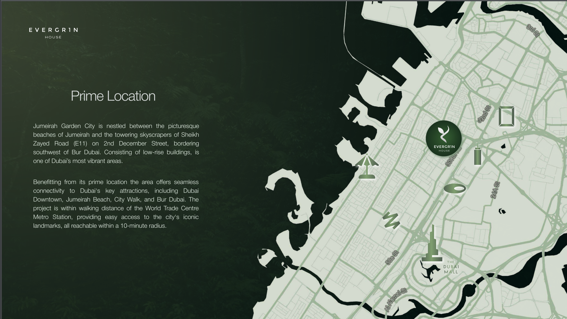 Discover Evergr1n House, a groundbreaking residential masterpiece by Object 1 CONTEMPORARY DEVELOPMENT, poised to redefine urban living in Dubai. Nestled in the heart of Jumeirah Garden City, this visionary project seamlessly blends cutting-edge architecture with the tranquility of lush green spaces, creating an unparalleled oasis amidst the city's vibrant pulse.