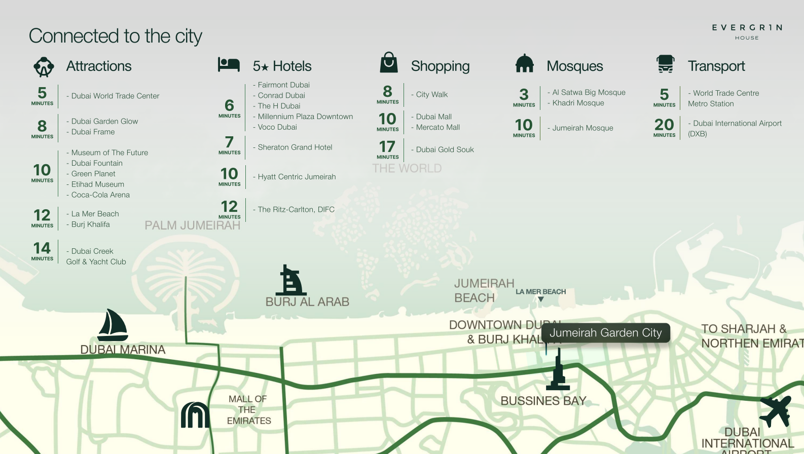 Nestled within the vibrant Jumeirah Garden City, Evergr1n House 3 boasts a strategic position in Al Satwa, a neighborhood celebrated for its unique blend of contemporary convenience and authentic urban charm. Residents will benefit from seamless connectivity via Sheikh Zayed Road and other arterial routes, ensuring swift access to Dubai's most iconic destinations. A mere 15-minute drive connects you to the world-renowned Dubai Mall and Burj Khalifa, while DIFC is just 20 minutes away. Furthermore, proximity to Dubai's pristine beaches and waterfront hotspots enhances the lifestyle appeal. Daily essentials are within walking distance, including clinics, schools, and retail outlets, fostering a truly self-sufficient and integrated community experience.