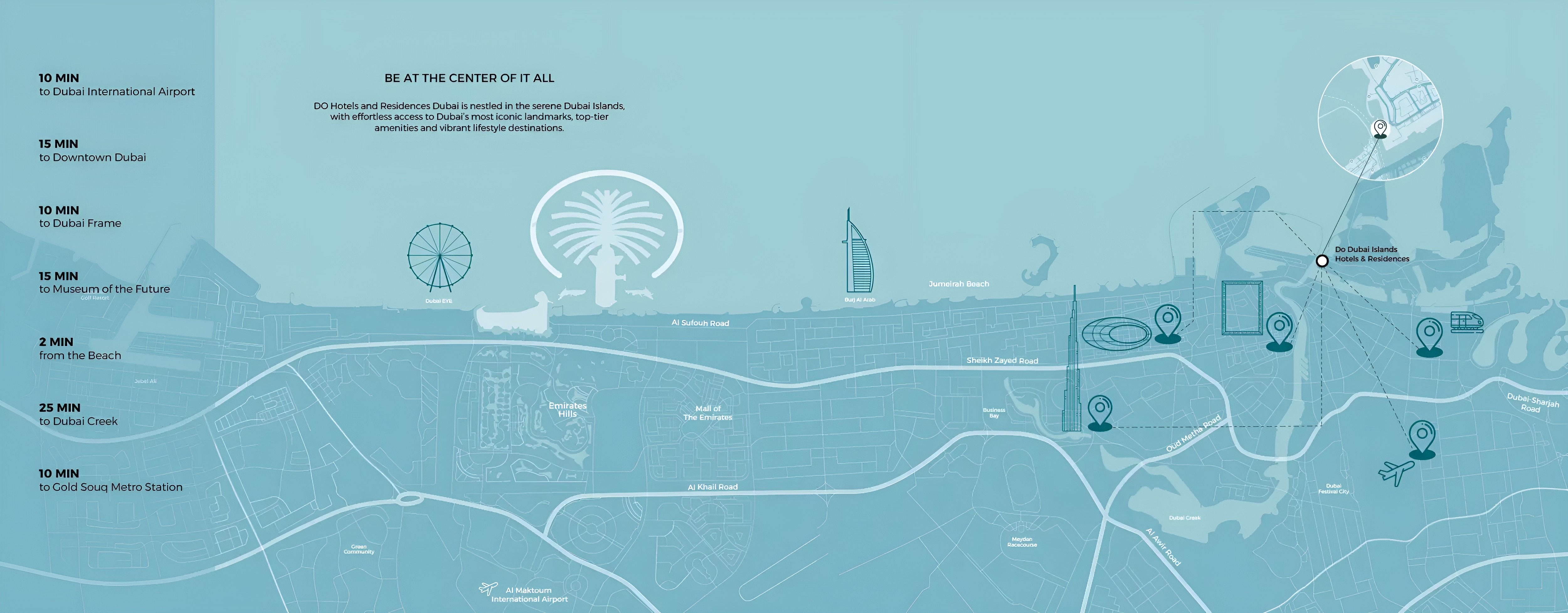Nestled along the pristine shores of Dubai Islands, Do Hotels & Residences boasts a prime beachfront location that offers serene tranquility while maintaining seamless connectivity to the bustling heart of Dubai. This rapidly emerging coastal destination is celebrated for its premium retail, world-class entertainment, and state-of-the-art marina facilities, all framed by breathtaking beaches. Residents benefit from exceptional accessibility, with Dubai International Airport just a 10-minute drive away and the Gold Souq Metro Station providing an effortless gateway to the wider city. Cultural landmarks like Downtown Dubai and the Museum of the Future are also within easy reach, striking a perfect balance between resort-style relaxation and urban convenience. This strategic positioning makes the project an irresistible opportunity for astute investors, discerning homeowners, and those seeking an elevated hospitality-driven coastal lifestyle.