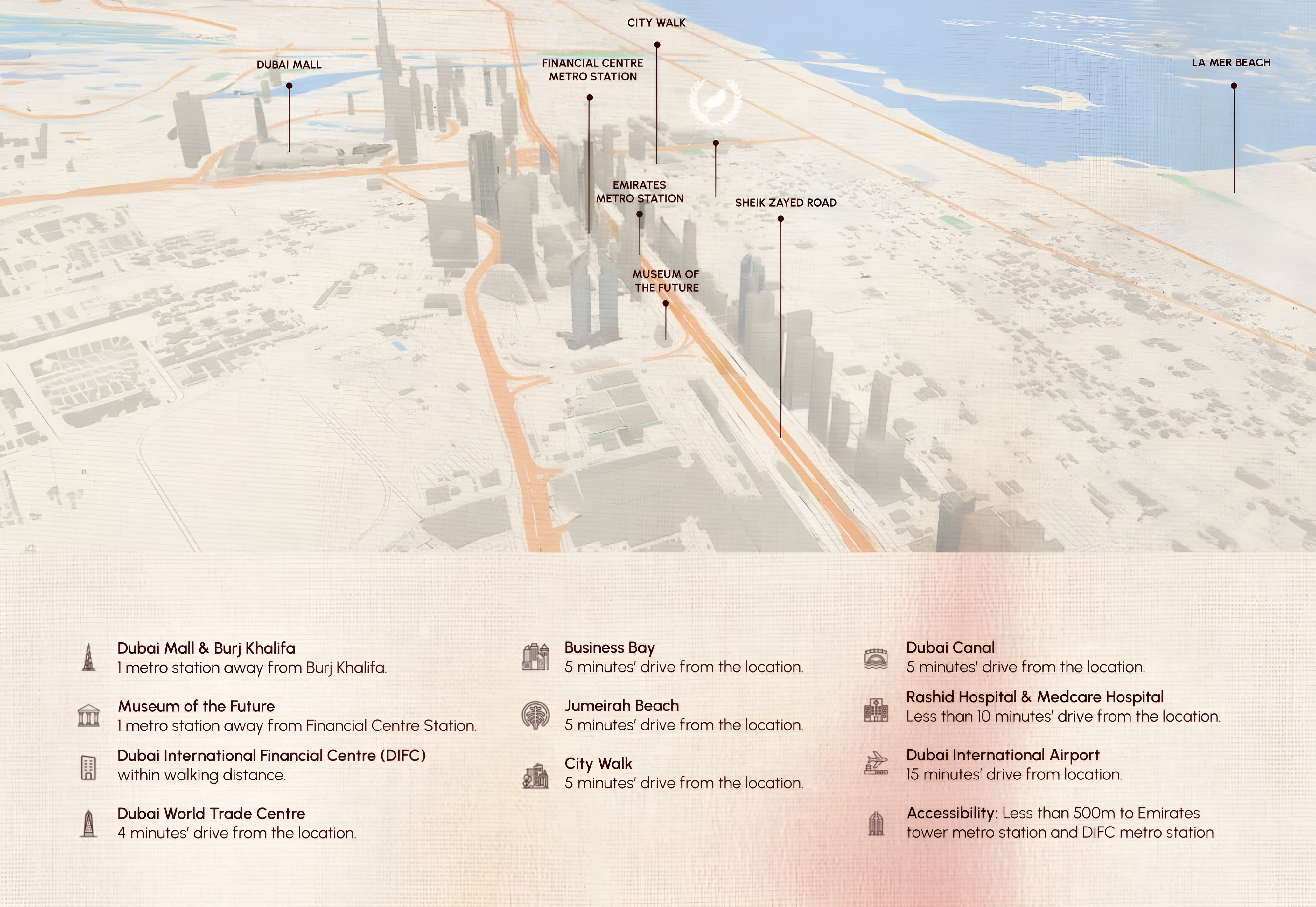 Strategically positioned in the highly sought-after Jumeirah Garden City, The Grandala boasts an enviable location that places residents at the nexus of Dubai's most iconic destinations and essential conveniences. Enjoy swift access to the pristine shores of La Mer Beach, perfect for leisurely strolls and seaside relaxation. Connectivity is effortless with immediate access to Sheikh Zayed Road, linking you seamlessly to all major business hubs, entertainment zones, and cultural landmarks across the emirate. Residents will also find themselves surrounded by a plethora of urban amenities, including world-class shopping malls, gourmet dining establishments, and vibrant entertainment options, all just moments away.