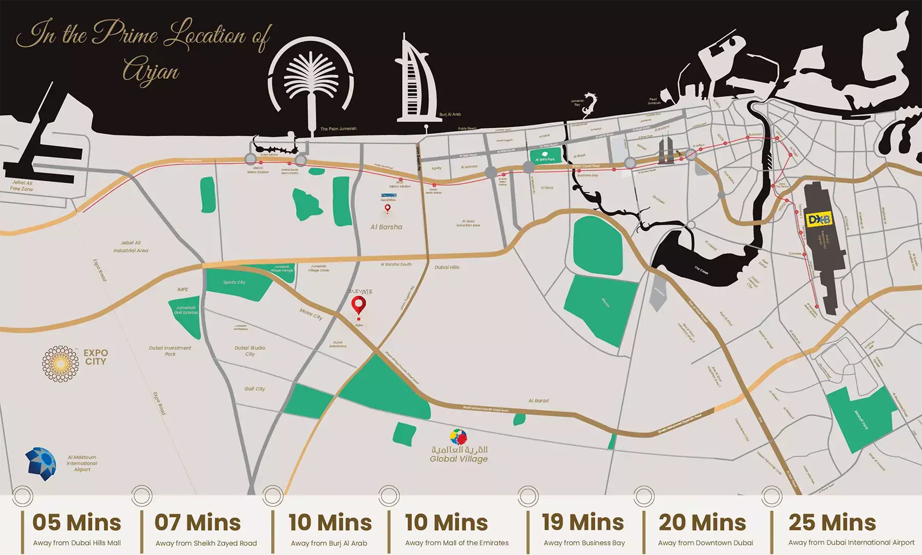 Strategically situated in Arjan, Elevate By Prescott boasts a prime location that provides seamless connectivity to Dubai's most crucial destinations. Residents will find themselves mere minutes away from major corporate hubs, iconic landmarks, and world-class leisure attractions, ensuring a life of ultimate convenience and access. Whether it's the bustling business districts, the serene green spaces, or the thrilling entertainment venues, everything is within effortless reach.