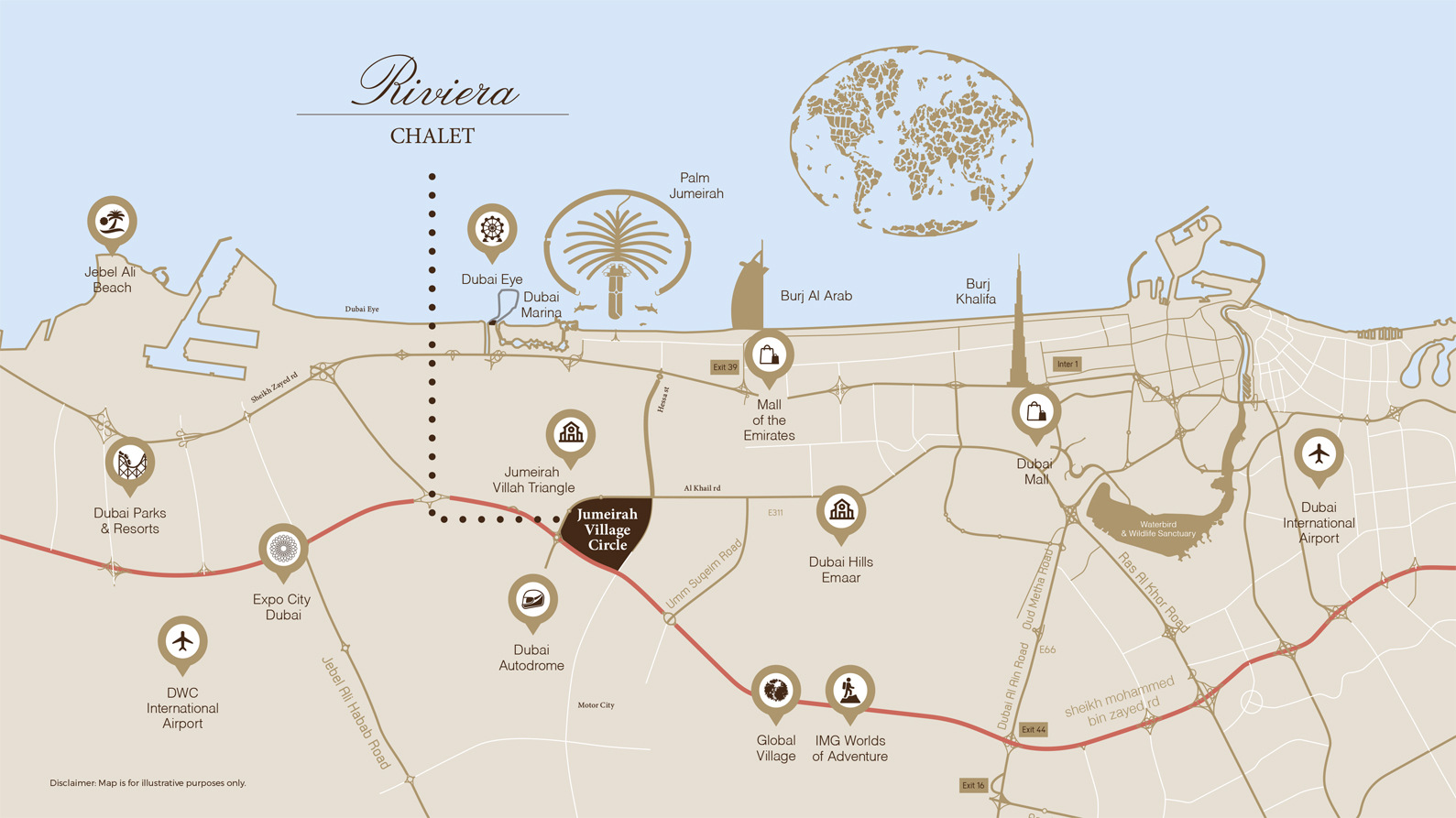 Strategically positioned within the highly sought-after Jumeirah Village Circle, Riviera Chalet offers residents the perfect balance between serene suburban charm and vibrant urban accessibility. JVC is renowned for its community-centric atmosphere, lush green spaces, and a comprehensive network of amenities, making it an ideal choice for both families and professionals. From Riviera Chalet, residents enjoy seamless connectivity to Dubai’s iconic destinations, including the shimmering sands of the Beach, the architectural marvel of Burj Al Arab, the vibrant Dubai Marina, and the world-famous Palm Jumeirah. Key facilities like tennis courts, the Creation Club with licensed F&B, and even Dubai International Airport are all conveniently within reach, ensuring every necessity and desire is met with ease.