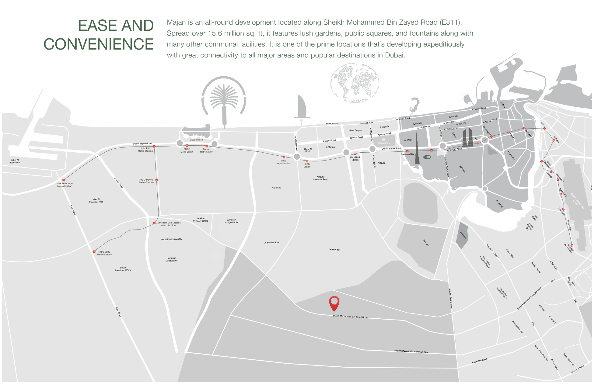 Strategically nestled in Majan, Dubailand, Samana Barari Lagoons offers residents the best of both worlds: serene suburban living with exceptional connectivity. Enjoy direct access to Sheikh Mohammed Bin Zayed Road, a vital artery facilitating seamless commutes across the city. Key destinations are mere minutes away, with Global Village just 10 minutes, Downtown Dubai a short 15-minute drive, and Dubai International Airport reachable in approximately 20 minutes. The development also boasts close proximity to leading schools, hospitals, and vibrant retail centres, all while being enveloped by lush green zones and expansive landscapes, fostering a peaceful and balanced lifestyle.