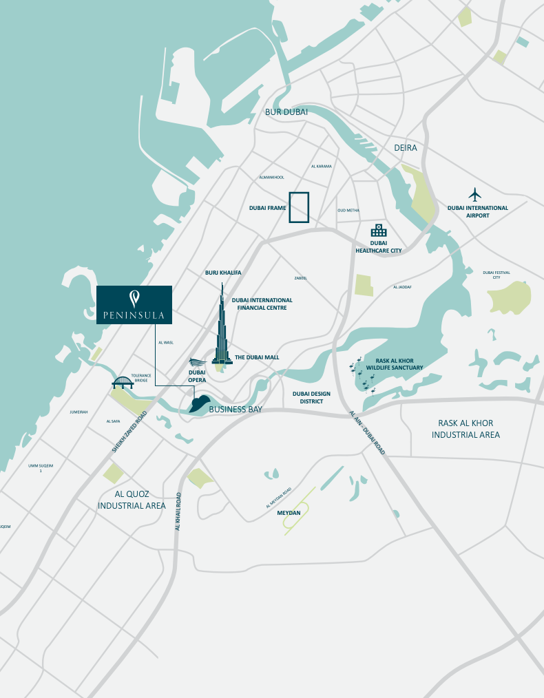 Peninsula Five’s prime location grants residents exceptional access to Dubai’s most iconic landmarks and dynamic districts. Imagine being mere moments away from the architectural grandeur of the Burj Khalifa, the cultural heartbeat of Dubai Opera, and the world-class shopping experience at Dubai Mall. With seamless connectivity to Sheikh Zayed Road, the entire city is effortlessly within reach, ensuring convenience for both leisure and business pursuits. The project’s setting within Business Bay promises a dynamic urban environment complemented by serene waterfront views, creating a unique balance of city vibrancy and tranquil escape.