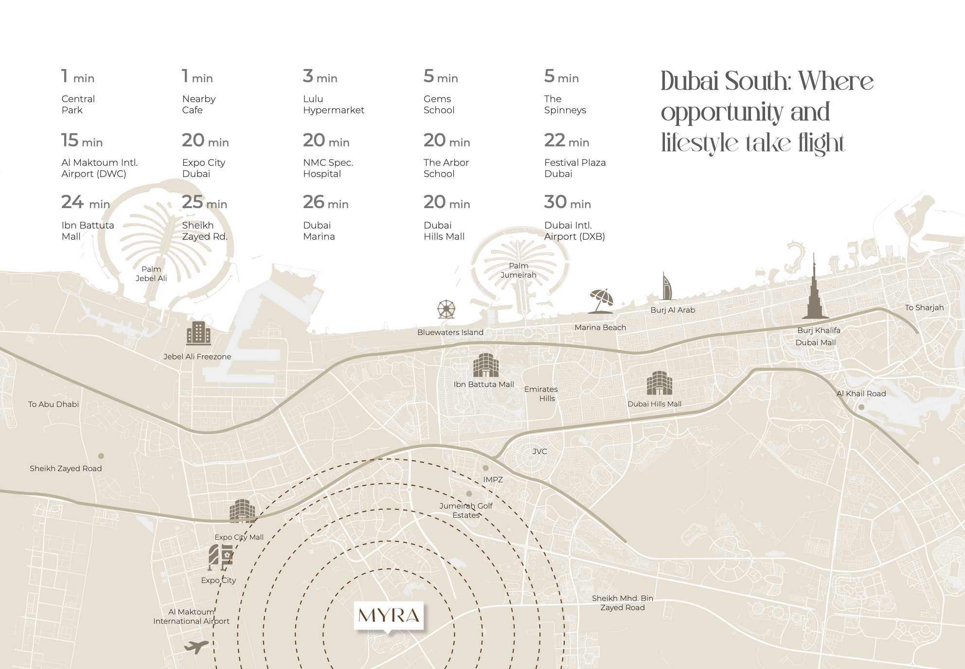 Strategically nestled within Dubai South, Myra Residences benefits from a prime location that balances peaceful living with dynamic growth. This ambitious district is fast becoming a global economic powerhouse, underpinned by its crucial role in logistics, aviation, and world-class infrastructure. Residents will enjoy immediate proximity to Al Maktoum International Airport, direct access to Expo Road and major arterial highways like Sheikh Mohammed Bin Zayed Road, ensuring seamless commutes across the emirate. The planned future metro line will further enhance transport accessibility, connecting you effortlessly to Expo City and its burgeoning business community.