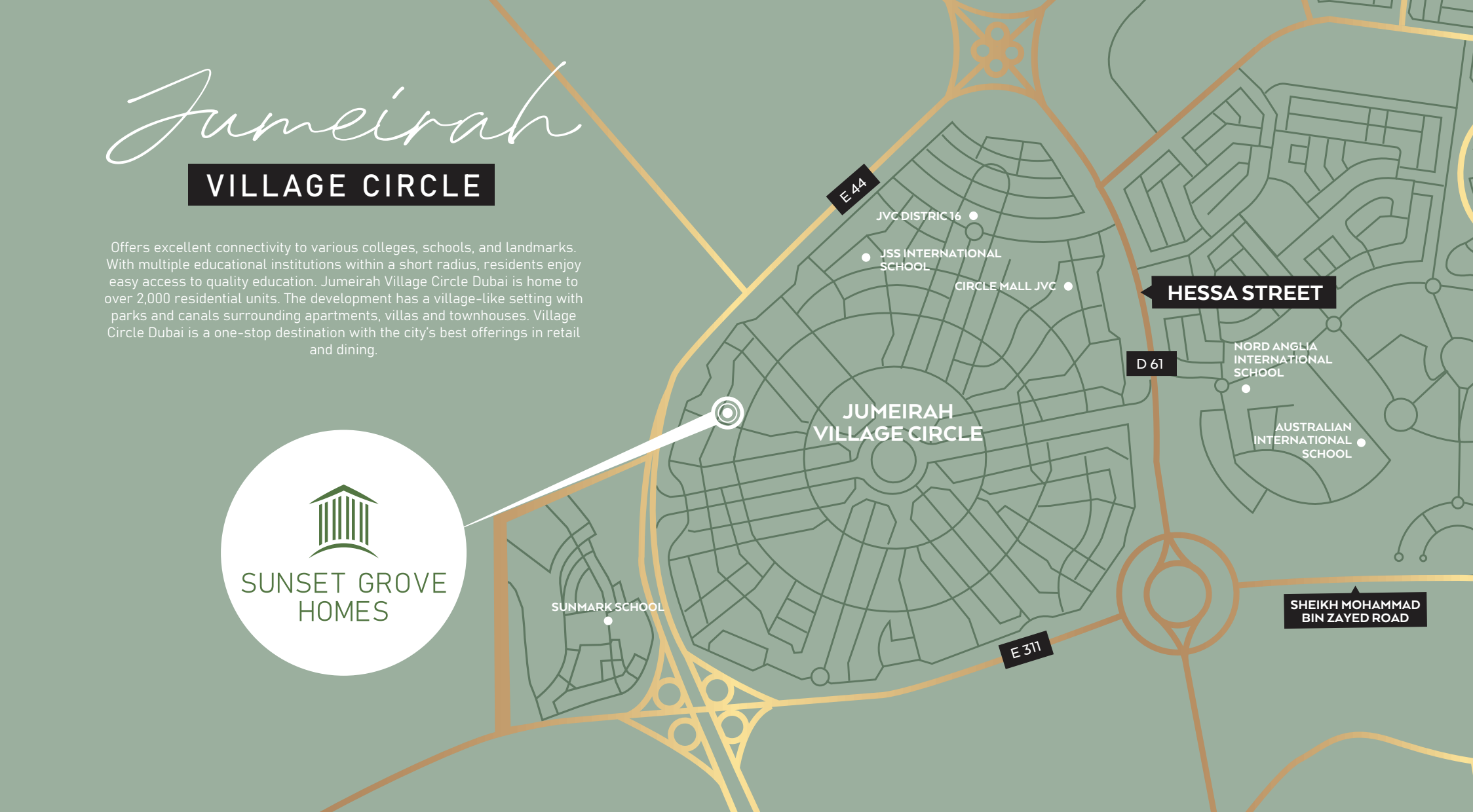 Strategically positioned, Sunset Grove Homes offers residents the dual advantage of urban convenience and serene suburban tranquility. Its prime location ensures seamless access to Dubai's major attractions, bustling business districts, world-class leisure destinations, and essential community amenities. Whether it’s a quick commute to work or an evening out, everything is within effortless reach, making it an ideal address for discerning families and professionals alike.