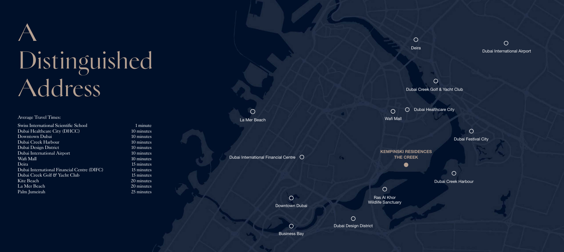 Kempinski Residences boasts a prime waterfront location, providing residents with easy access to Dubai's most iconic destinations. Downtown Dubai and Business Bay are a mere 20-minute drive away, while Dubai International Airport can be reached in just 15 minutes, ensuring effortless travel. For leisure and entertainment, the pristine beaches of Dubai Marina are only 30 minutes away, making every city amenity within reach.