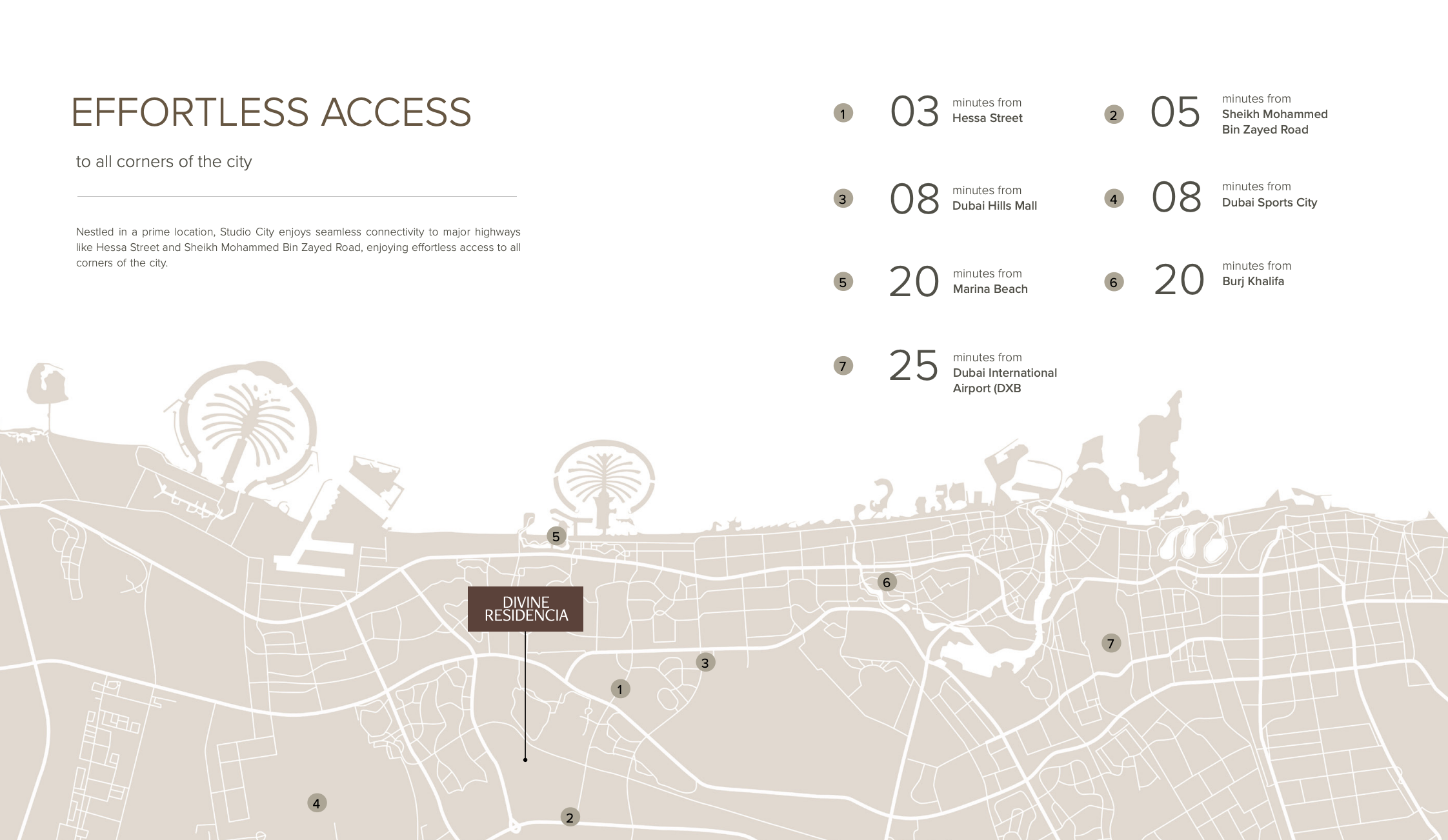 Nestled in a prime location, Dubai Studio City is renowned for its vibrant, family-friendly atmosphere and exceptional connectivity. Residents will benefit from swift access to key destinations across Dubai: a mere 3 minutes to Hessa Street, 5 minutes to Sheikh Mohammed Bin Zayed Road, 8 minutes to Dubai Sports City and Dubai Hills Mall, and a convenient 20-minute drive to iconic landmarks like Marina Beach and Burj Khalifa. Dubai International Airport is also easily reachable within 25 minutes, making it ideal for both local and international professionals.