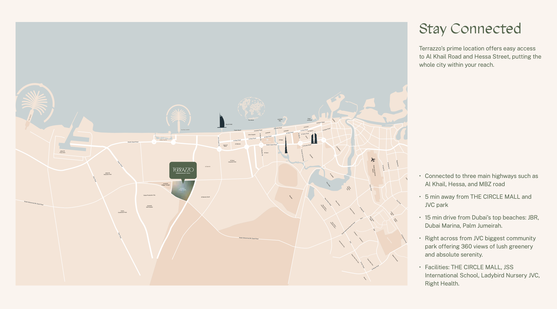 Strategically positioned in the heart of JVC, Terrazzo Residences ensures seamless connectivity to Dubai's vibrant lifestyle hubs, entertainment venues, and essential social infrastructure. Residents will enjoy the unique advantage of tranquil community living while remaining just moments away from the city's dynamic pulse, making it an ideal address for families and professionals alike.