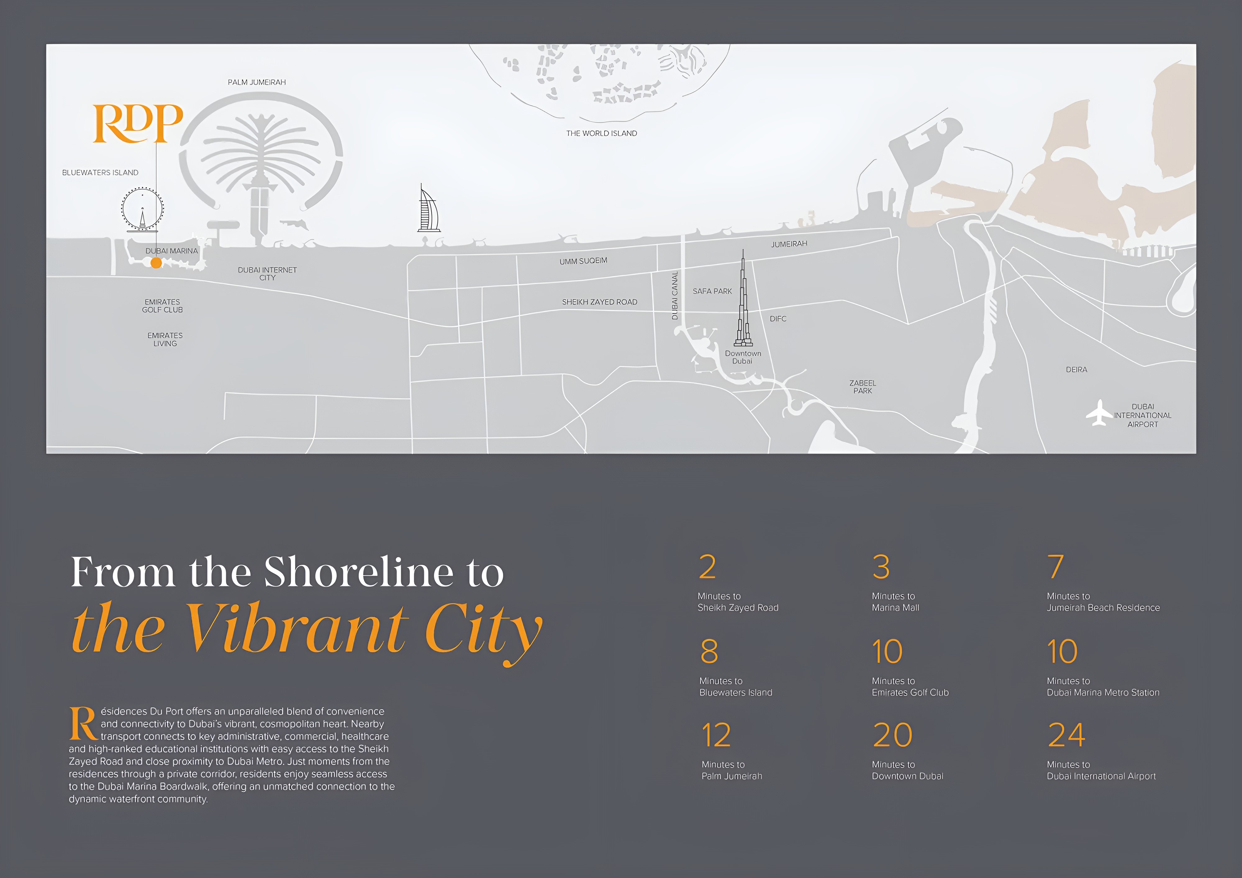 Strategically positioned in the epicentre of Dubai Marina, Residences Du Port ensures residents enjoy both serene waterfront tranquility and unparalleled urban connectivity. Imagine leisurely strolls along the Marina Boardwalk just steps from your door, or indulging in Dubai’s finest dining and boutique shopping experiences within minutes. The development provides swift access to iconic destinations like Palm Jumeirah and Bluewaters Island, while Sheikh Zayed Road offers seamless connections to major business hubs and the city’s vibrant pulse. For recreation, the Emirates Golf Club is merely a short drive away, complementing the immediate proximity to Dubai Marina Mall. This prime location truly offers a balanced lifestyle, blending peaceful waterside charm with metropolitan convenience.