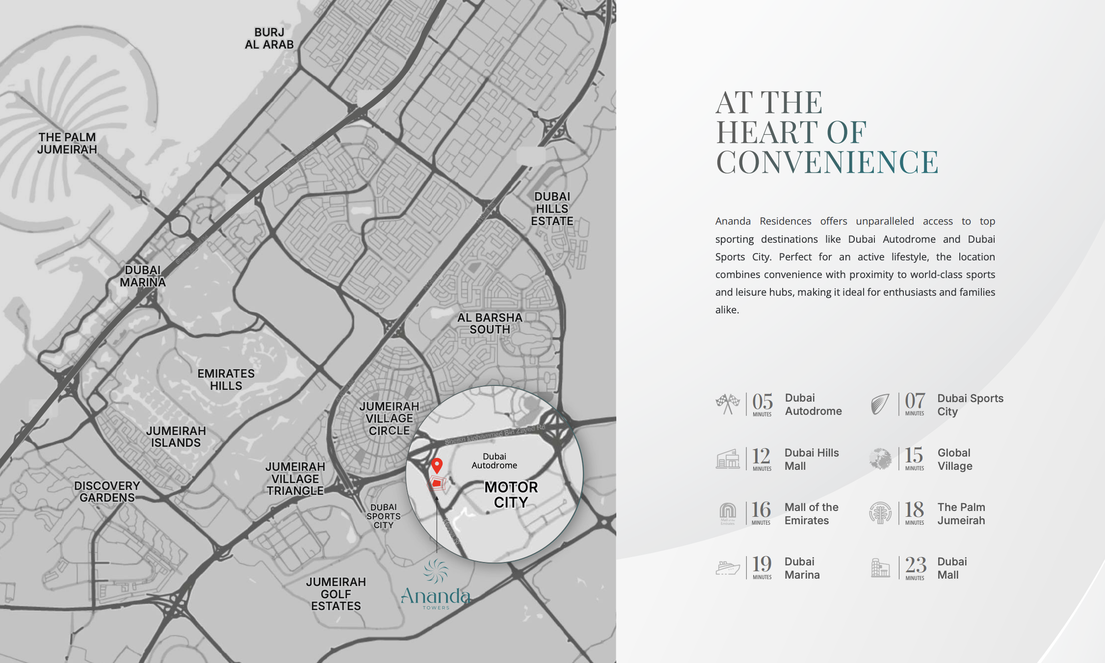 Strategically nestled in the heart of Motor City, Ananda Residences boasts a prime location that provides residents with effortless access to Dubai's major highways, ensuring swift travel to all corners of the emirate. Its proximity to key business districts such as Dubai Internet City, Media City, and DIFC makes it an ideal address for professionals. Furthermore, residents will enjoy immediate access to an abundance of shopping malls, fine dining establishments, entertainment venues, top-tier educational institutions, and world-class healthcare facilities, ensuring every convenience is at their doorstep.