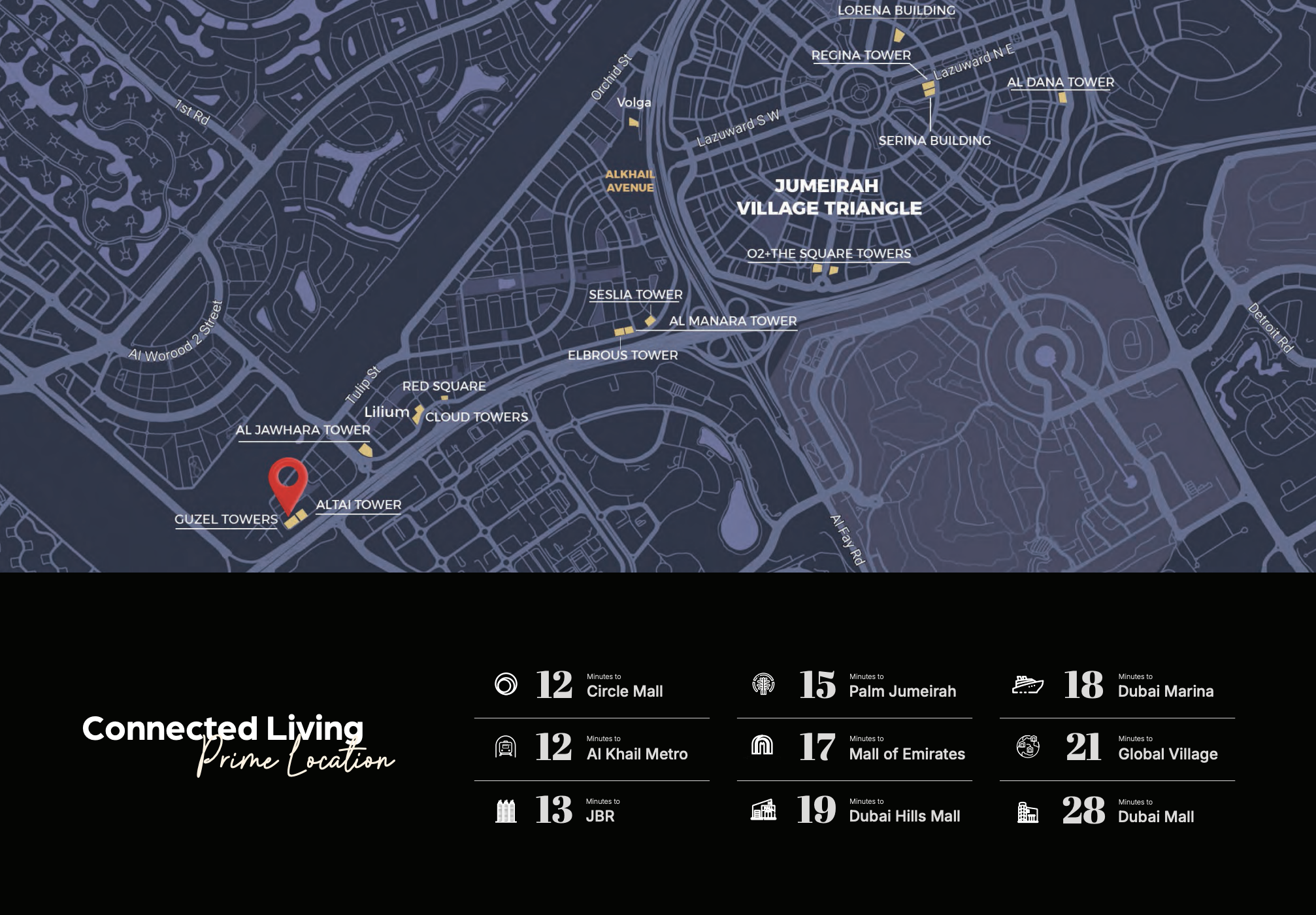 Strategically located in JVT, Guzel Tower provides residents with the perfect balance of urban convenience and serene suburban tranquility. Enjoy effortless connectivity to Dubai's major landmarks and business districts, while retreating to a peaceful sanctuary away from the city's hustle. Key destinations are remarkably close, with City Centre just a 5-minute drive, Dubai Sports City 10 minutes away, Mall of the Emirates accessible within 15 minutes, Dubai Marina in 20 minutes, and Downtown Dubai reachable in just 25 minutes. Future metro extensions and well-connected bus routes, alongside ample parking, ensure seamless mobility for all residents.