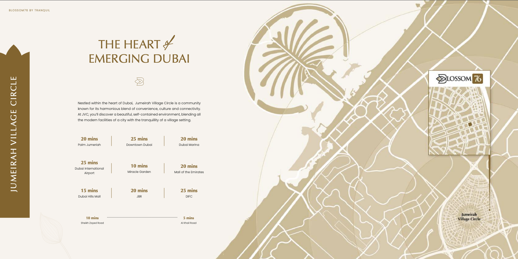 Strategically located in Jumeirah Village Circle, Blossom76 provides residents with the perfect blend of family-friendly tranquility and seamless connectivity to Dubai’s major attractions. JVC is renowned for its community spirit, lush green spaces, and easy access to key business districts, leisure destinations, and educational institutions, making it an ideal address for families and professionals alike.