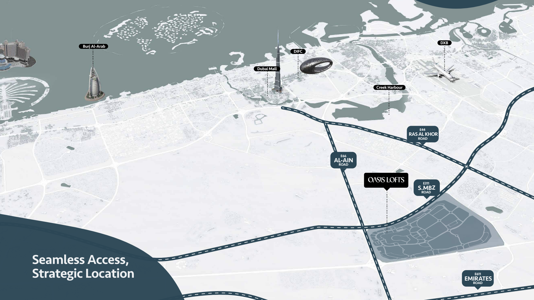 Strategically situated, Oasis Lofts enjoys a prime location that perfectly balances serene living with ultimate connectivity. Residents benefit from effortless access to major urban hubs including Downtown Dubai, Bur Dubai, and Dubai International Airport. The future-forward integration of the upcoming Dubai Metro Blue Line further enhances this connectivity, ensuring seamless commutes to the city’s most significant landmarks and business districts. Nestled amidst esteemed educational institutions, thriving commercial zones, and a wealth of retail and leisure destinations, Oasis Lofts is an ideal choice for professionals, families, and discerning investors seeking convenience at their doorstep.